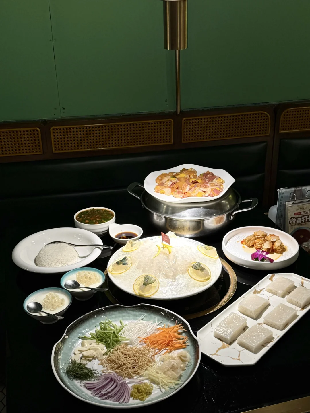 到底谁能拒绝这一顿!!! 鲜切广东扇鸡嫩到爆汁,鸡肉保留了原汁原味好鲜!!海肠捞饭脆嫩弹牙,米饭吸满汤汁黏糊糊超美味😋鱼生、虾生入口即化,吃到扶墙出!!