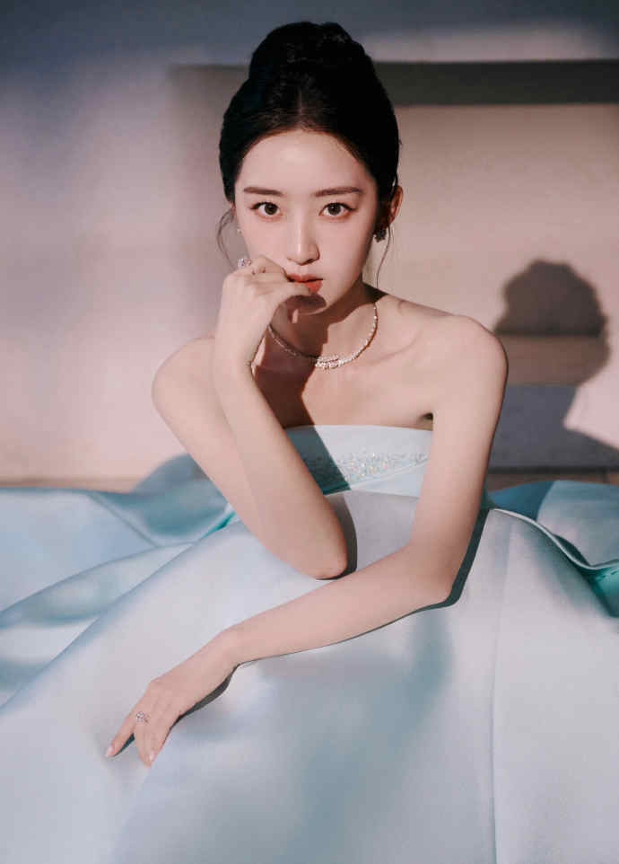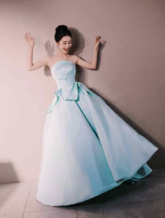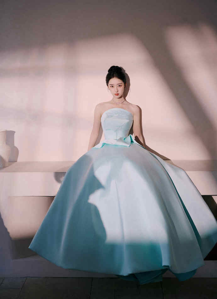 邓恩熙国剧盛典出图,盘发搭配天青色抹胸长裙,优雅梦幻的小公主