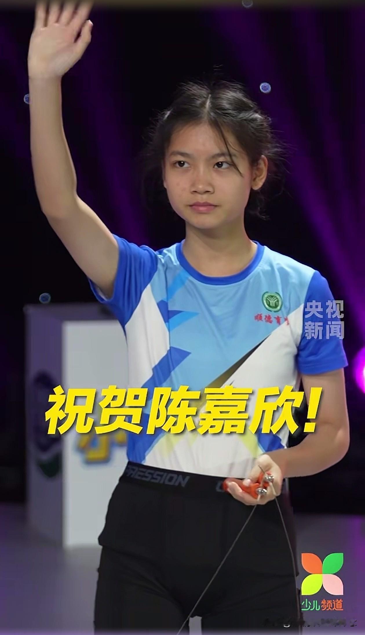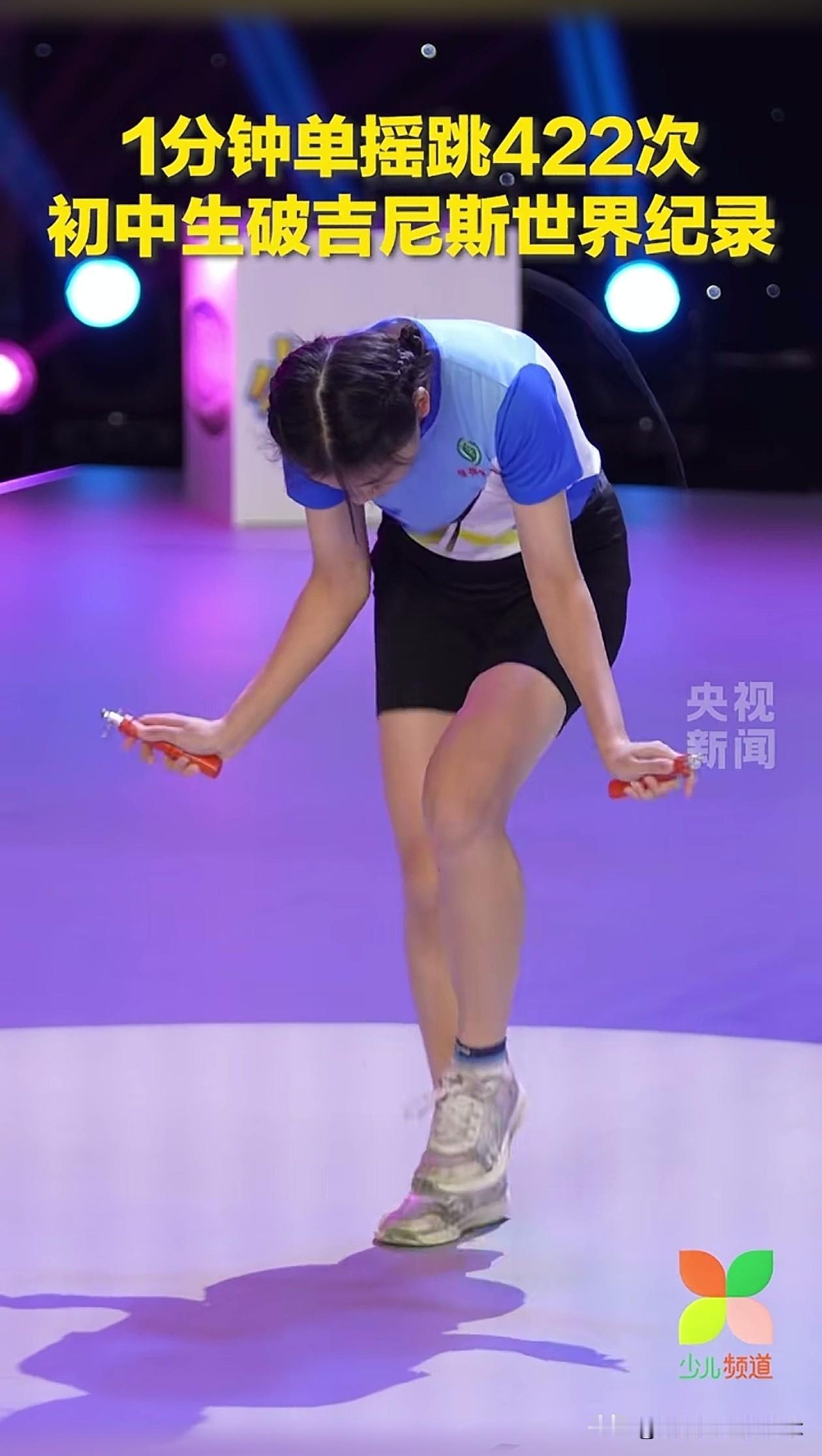 上央视新闻了! 广东女孩陈嘉欣一分钟跳422次, 打破吉尼斯世界纪录。 在首届CMG青少年跳绳公开赛上,初中生陈嘉欣一分钟单摇422次,刷新了吉尼斯世界纪录! 陈嘉欣就读于广东省佛山市顺德区勒流育贤实验学校初中部,因为跳绳速度快,被称为“无影脚、隐形绳”。 网友评价: “我数都数不过来,别说跳了。” “速度快到已经根本看不到绳子了。” 祝贺陈嘉欣,虽然比赛场上你只有一分钟的出彩,但是你取得的成绩让别人望尘莫及。这背后定是你无数个日夜的坚持与汗水,是你用孤独和伤痛换来的不凡。 少年强则国强,中国少年的极限,从不被定义。