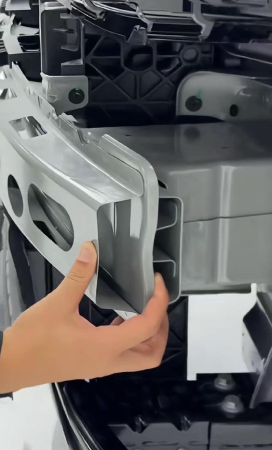 尚界H5的防撞梁设计,大家能打多少分? 第一眼看上去会产生误会,怎么防撞梁上面还有孔,其实这个相当于其他汽车上的防撞泡沫,起到缓冲作用。 真正的防撞梁是在这一块软铁的后面,是用热成型钢的材料,受限于成本,肯定没有办法像其他车企大规模采用铝合金。 这个车的防撞梁也是采用了现在非常先进的设计,不仅上面有一个主防梁梁,下面还有一个副防撞梁,吸能盒还有相应的诱导设计。 各位是怎么看的?欢迎评论区留言。
