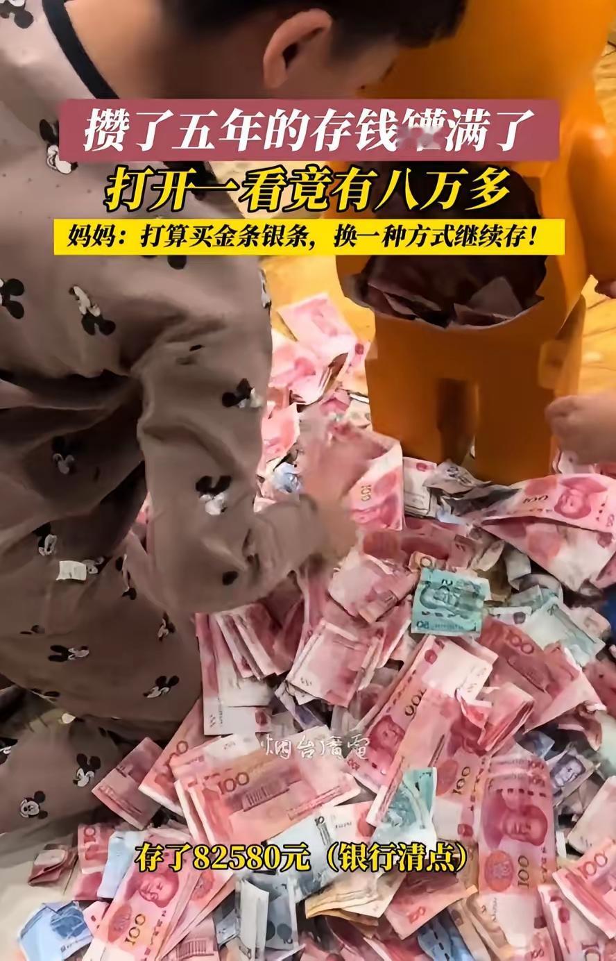 咱就是说,那个存钱罐但凡质量差一点,都装不下这一家子的暴富梦。山东日照的沈女士一家,五年里有个默契:甭管是压岁钱还是手头零钱,都自觉往罐子里塞。最近罐子“爆仓”了,全家人围着一顿清点,好家伙,整整82580元! 隔着屏幕都能听见数钱的哗啦声和全家人的笑声。这笔“意外之财”的处置方式也很实在——准备给两个儿子换成银条金条,继续存着。这大概就是最朴素的家庭理财课:积少成多,聚沙成塔。 不过友情提示,买存钱罐千万别买那种不锈钢的“现代貔貅”,否则攒钱一时爽,开罐火葬场,最后可能还得劳驾消防员用专业工具破拆。你家里有这种充满“历史感”的存钱罐吗?敢不敢打开看看里面藏着多少“时代的眼泪”?