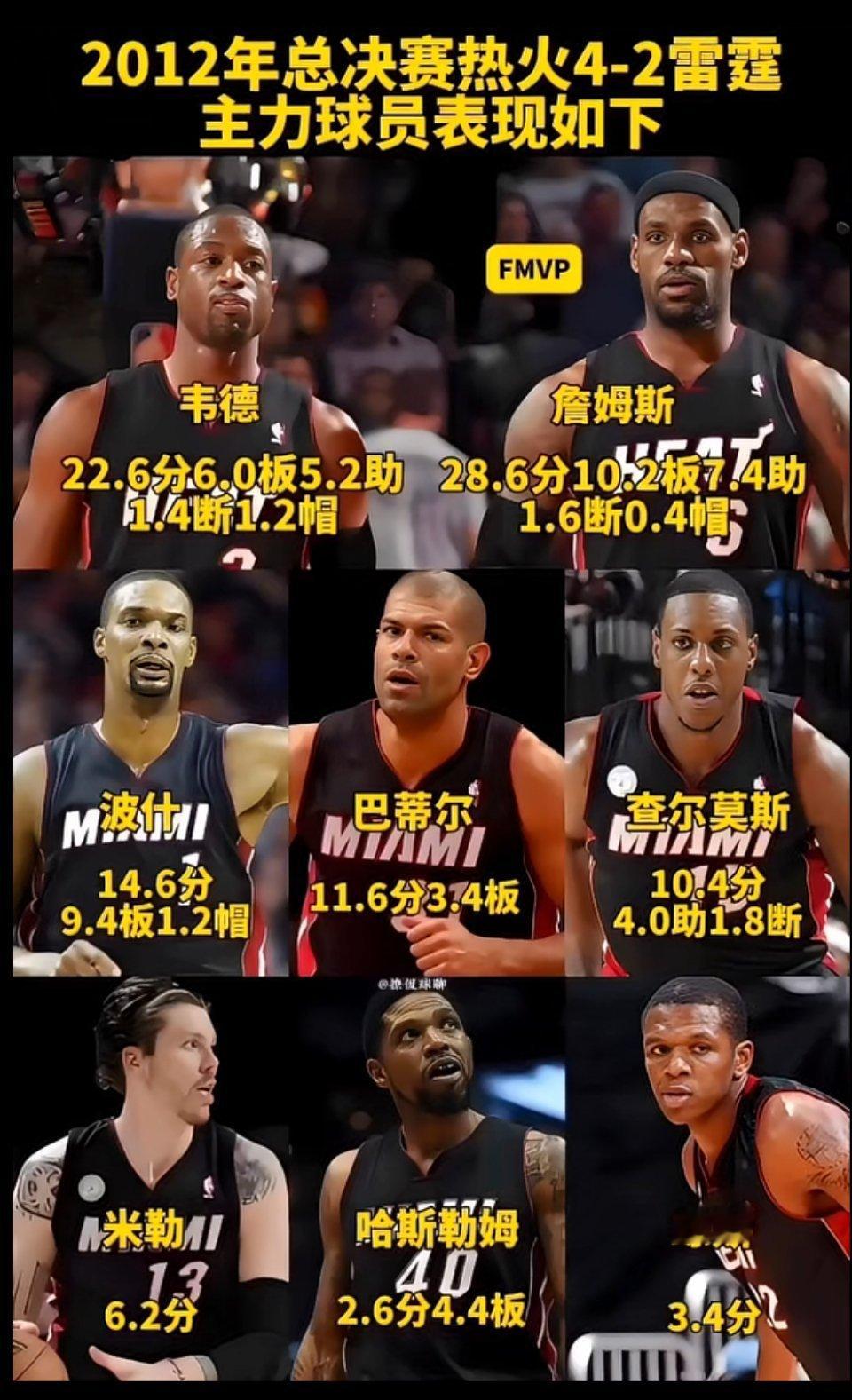 2012年总决赛热火球员数据表现!詹姆斯得分篮板助攻全队第一!绝对单核!!!