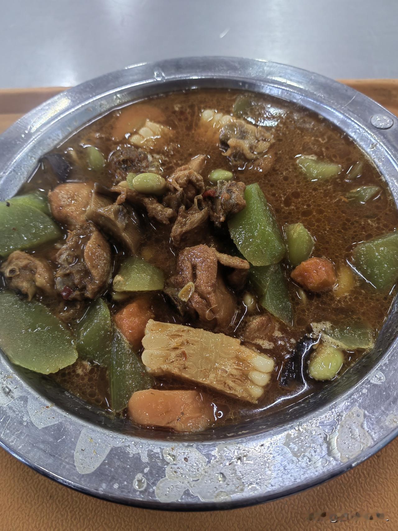 中午没回家吃饭,去餐厅点了一份大杂烩,花了十二块钱,里边有鸡块、莴笋、胡萝卜、毛豆、黑木耳,吃起来还不错。