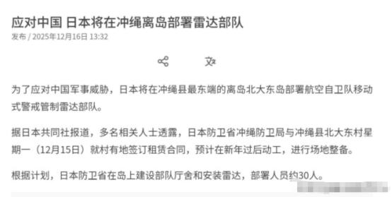 日本果然开始做动作了!面对我们的警告,日本根本不听!12月16日,根据外媒报道,多名知情人士透露称,为了应对中国军事威胁,日本将在冲绳县最东端的离岛北大东岛部署航空自卫队移动式警戒管制雷达部队。报道称,此举旨在针对经由冲绳本岛与宫古岛之间进入太平洋的中国航母与军机增强监视能力。 日本这次在北大东岛的动作,藏着三步棋。第一步是选点,这个冲绳最东端的离岛,孤悬在太平洋上,距宫古海峡直线距离不到200公里。 咱们的航母编队每次前出西太,宫古海峡是必经之路,日方把雷达架在这儿,等于在咱们家门口支了个望远镜。 雷达开机后300公里的探测圈,刚好罩住海峡南口,连台湾以东的部分空域都能蹭到。 去年辽宁舰编队过海峡时,日方战机还得从冲绳本岛紧急起飞跟踪,现在直接在前线蹲点了。 第二步是提速。原本分两年的预算,防卫省今年砸了461亿日元的补充预算,跳过招标直接开工。 当地村民的反对声刚平息,新年后就要整地。 这种非常规操作,暴露的是日方对"监控窗口"的焦虑,他们算准了,咱们航母常态化西太训练的节奏在加快,去年穿越宫古海峡的次数比2020年多了一倍,必须抢在咱们形成行动规律前把雷达立起来。 第三步是破局。战后日本的雷达网一直围着本土转,太平洋方向从伊豆群岛到小笠原群岛,大片海域都是监控盲区。 这次北大东岛的部署,等于把防线向东推了300公里,彻底打破"专守防卫"的地理边界。 更关键的是,雷达数据通过"佳其"系统实时传给美军,去年美日联合军演时,这种数据共享已经试过,咱们战机刚出海,驻日美军的E-2D预警机就起飞了。 有人觉得这只是单纯的监视升级,错了。 北大东岛的雷达,和冲绳本岛的第15旅改师、宫古岛的12式反舰导弹,正在形成三角布局。 第15师去年扩编为师团,驻地那霸离台湾仅110公里,新组建的快速反应部队专门练过"离岛夺还"。 雷达发现目标后,反舰导弹部队10分钟内就能进入发射阵位,这种"探测-打击"链条,摆明了是为台海有事准备的。 日方自己也不藏着。防卫省的文件里明说,太平洋一侧是"警戒空白",现在要补上。 但这个"空白",其实是战后秩序留给东亚的安全缓冲带。 过去几十年,日本把雷达集中在九州、四国,对着朝鲜半岛和东海,太平洋方向的宽松,让咱们的舰机穿越岛链时有更大的战略空间。 现在这个缓冲没了,咱们每次出海,都要面对前沿部署的雷达、导弹,还有随时可能起飞的F-15EX。 更值得警惕的是预算逻辑。2025年防卫费占GDP突破2%,比原计划提前两年,钱都砸在西南诸岛。 北大东岛的雷达不是孤立的,配套的还有那霸基地的跑道扩建、海上运输群的10艘补给舰。 去年美军把嘉手纳的F-15换成F-15EX,就是看中这里离台海近,而日本的雷达刚好能给美军当"眼睛"。 这种美日深度捆绑,让台海局势的变量成倍增加。 咱们的应对其实早就开始了。今年航母编队过宫古海峡,采取了"多航线、多时段"的机动模式,昨天走中线,今天绕南口,让日方摸不着规律。 东部战区的电子战飞机,时不时在雷达探测边缘"晃悠",去年还试过全频段干扰,让冲绳的雷达屏幕闪过雪花。 更关键的是,咱们在福建方向的导弹部署,东风-17的射程刚好覆盖冲绳诸岛,这种"你动我动"的反制,日方不是不知道后果。 但日本似乎算错了账。他们以为把雷达往前推,就能增加谈判筹码,却忘了台海对咱们是核心利益。 上世纪90年代,咱们还能用渔船破袭岛链,现在航母战斗群常态化存在,日方的监视成本只会越来越高。 去年辽宁舰在西太待了21天,舰载机起降超过300架次,这种存在本身,就是对前沿部署的最好回应,你架你的雷达,我走我的航线,战略主动始终在咱们手里。 冲绳的老百姓其实最清楚。北大东村的渔民去年还在抗议,说"不想变成战场",但最终还是签了租约。这种无奈,折射出日本战略的畸形,为了配合域外势力,把离岛变成前线。 1945年冲绳战役的伤痕还没愈合,现在又要当"第一岛链的炮灰"。这种拿本土安全赌地缘政治的做法,最终伤害的是日本普通民众的利益。 说到底,日本的军事扩张,本质是想借台海之乱突破战后秩序。从2013年解禁集体自卫权,到2022年安保三文件,再到今天的雷达部署,一步步踩着红线走。 但他们忘了,咱们维护主权的决心,比任何岛链都坚固。当日本把雷达对准宫古海峡时,咱们的反制早已超越了战术层面,航母常态化巡航、高超音速导弹列装、区域拒止能力的提升,正在重塑西太的战略平衡。这场较量,时间不在日方那边。