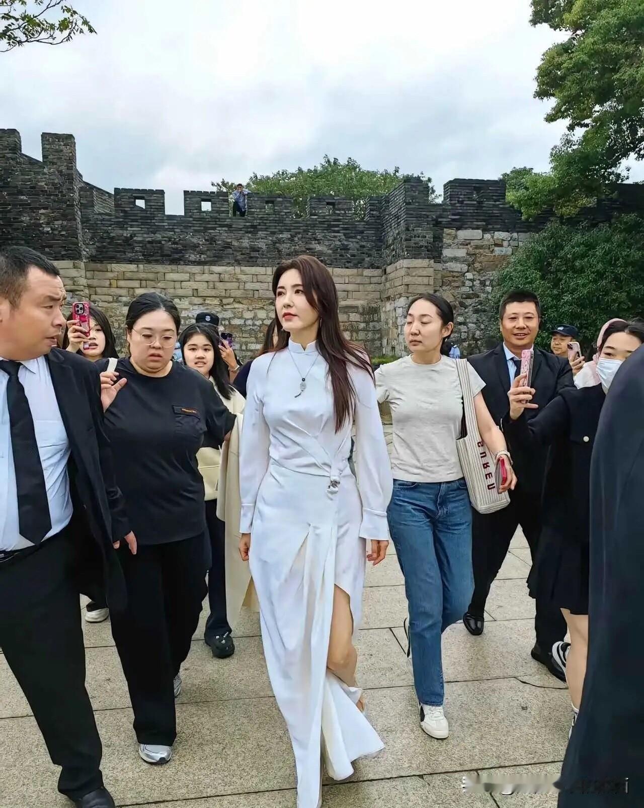 这是谁啊?这么多的工作人员随行跟着,看起来特别有气场。感觉她是属于不上镜的那一种女明星,本人线下特别高挑,气质独特。 听说她都快50岁了,还这么年轻,不把自己优秀基因传承下去实在是太可惜了。