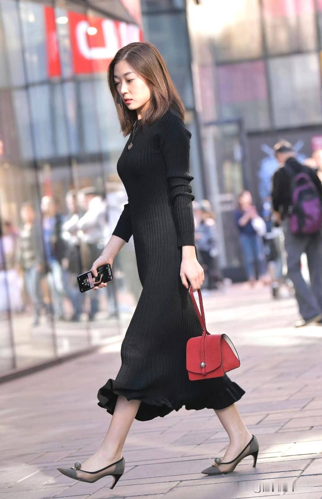 优雅黑色连衣裙,搭配亮眼红色手袋,都市时尚感十足