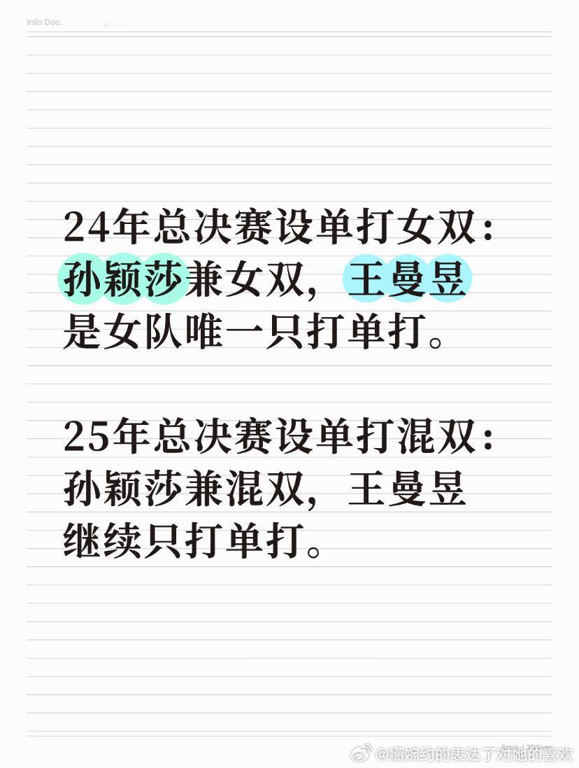 孙颖莎绝大多数时间一直需要打混双,混双还要拖航母打到冠军给所有人兜底,就这样的情况下,王曼昱仍然四年没拿到三大赛冠军了🙊🙊🙊🙊🙊,可见一斑