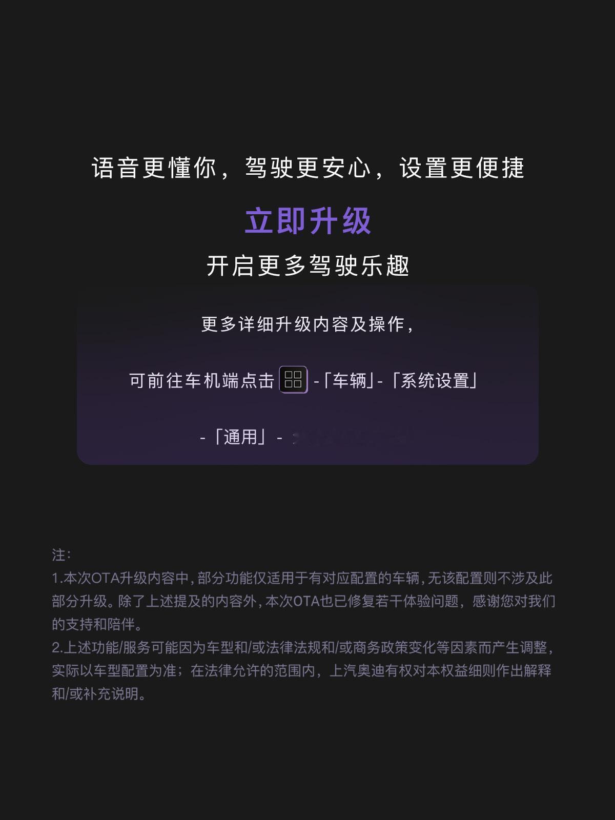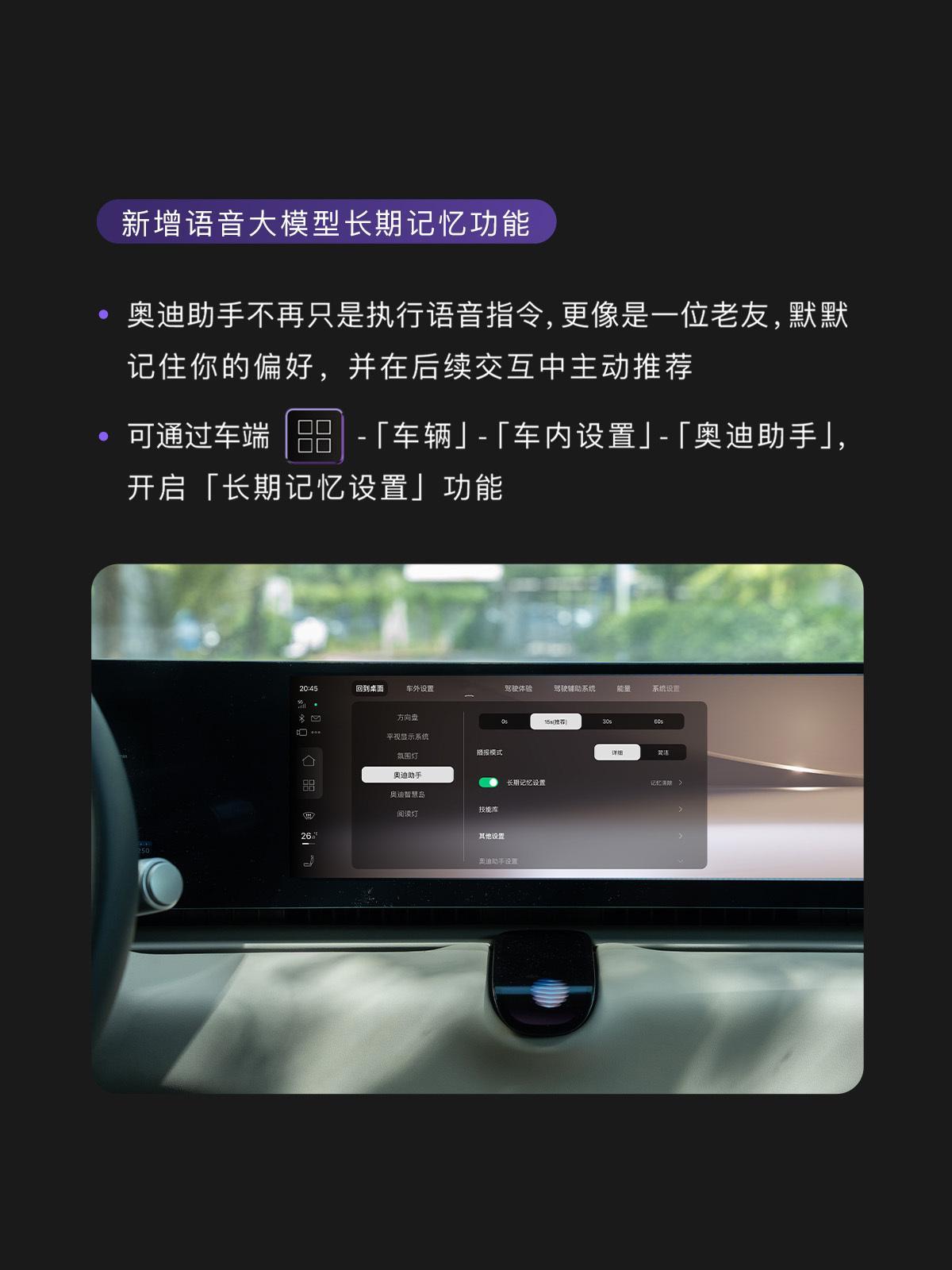 我的车今天好像有情绪了在智能汽车时代,OTA升级已从加分项变成了必需品,它直接关乎用户的用车体验。近日,奥迪E5 Sportback已完成首次OTA升级,主要围绕个性化交互、场景化智能和视觉体验进行深度进化,让车变得更懂你、更好用。 升级后,奥迪助手有了长期记忆功能,它会记住你爱听的音乐等场景,不用反复说;氛围灯也变得更贴心,白天夜晚都一直亮着,车内驾驶氛围直接拉满。同时操作界面也更人性化,车窗、门锁等安全设置都放在一起,副驾乘客还能帮忙设置导航,分担主驾压力。 另外,这次升级给日常开车加了不少贴心小功能。比如倒车时深踩刹车就自动驻车,不用专门找按钮;电子后视镜的警示更显眼;一上车空调、座椅加热这些常用设置就已经准备好了,省去每次手动打开的麻烦,还新增了10多种表情,结合车辆使用的不同场景,还有特定节日触发,让开车变得更有乐趣,也更贴近驾驶者的情绪 除了软件的持续进化,上汽奥迪也同步升级了全国近200家服务网点,全年提供超10万次专业服务,让豪华体验覆盖用车全周期。这次OTA升级让车主感觉到,奥迪不仅在造一辆好开的车,更在持续提供一种更聪明、更人性化的出行体验。AUDI迎来大规模OTA