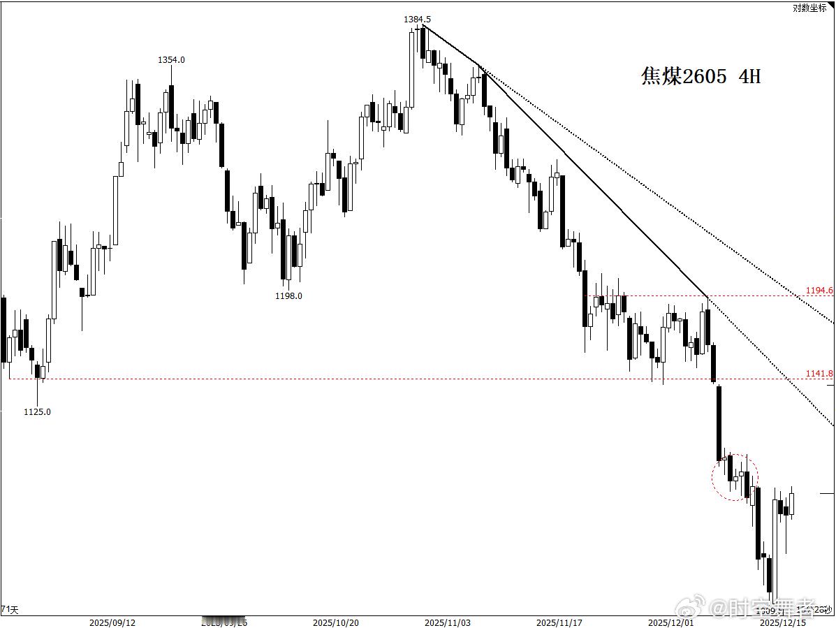 焦煤 焦煤要继续重点关注1080/1090一线阻力情况,该线位置之所以反复提到,是因为这一线是前期加速下跌后的二次起跌点(下图红色圆圈所示),如果回升企稳,短期阶段性反弹逻辑可能得到强化。