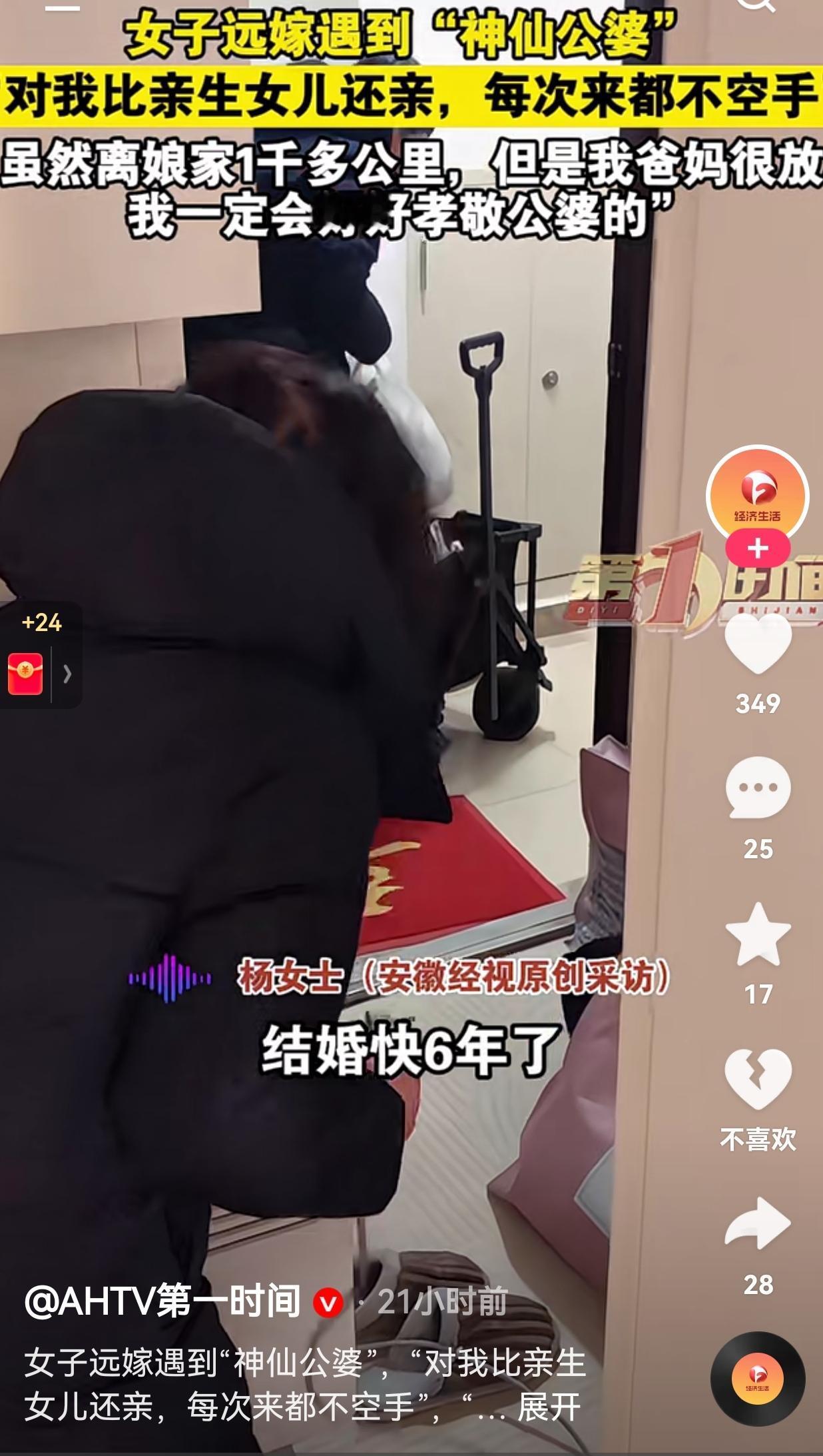 太羡慕了!怎么会有这么好的公婆呢?杨女士远嫁辽宁沈阳,离娘家差不多有一千公里,人们都说远嫁是一场豪赌,可是,她真的是嫁对人了。 据杨女士讲述,自己跟先生结婚快六年了,公公婆婆对她比亲生女儿还要好。她和公婆不住一起,但是,公婆经常来看她,每次来从来都是大包小包,给她带来很多好吃的。 比如蓝莓和草莓,这些价格昂贵的水果,公婆从来不吃,因为她们嫌贵。可是,她们却舍得给儿媳妇买,一买就是一箱,一点也不吝啬。 杨女士说:有这样的公婆,我爸妈都很放心,等她们年纪大了,我也会好好孝顺她们。 有网友评论道,你是朝哪个方向磕头的,拥有这么一个顶级的好公婆,告诉我,我也磕头! 还有的网友说,原来远嫁也可以过得很幸福,只不过,你要擦亮眼睛嫁对人而已。 我们总说远嫁是一场豪赌,赌的不是丈夫的爱,而是婆家对媳妇的态度。有些婆家把儿媳当外人,喜欢分着你我。而有些婆家却把儿媳当家人,捂热人心。从来没有什么“神仙公婆”,只有真心换真心的珍惜——你把我当女儿疼,我便把你当亲爹娘孝。 远嫁的意义,从来都不是离开原生家庭,而是多了一对疼你的爸妈,多了一个永远为你敞开的家门。 大家觉得呢?欢迎大家评论区讨论留言。