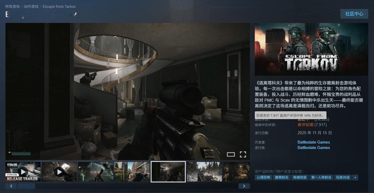 【运营鬼才尼基塔】《逃离塔科夫》官方宣布,游戏1.0版本推出后销量已突破100万份。本作在Steam平台上的国区好评率为14%,收录超7900篇玩家评测。