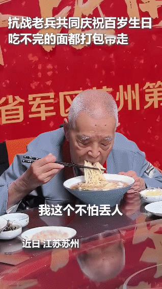 抗战老兵迎来百岁生日,众人欢聚为他庆生,席间老人吃完长寿面后,执意要把没吃完的面打包带走。他略带腼腆地说“不要笑话我啊”,还念叨着年轻时从没吃过这么好的饭菜,“不能浪费,这是一种美德”。一枚枚勋章见证着他的戎马岁月,而这份刻在骨子里的节俭,更让我们看到了老英雄最质朴的品格。对老兵的赞扬 百岁老军人