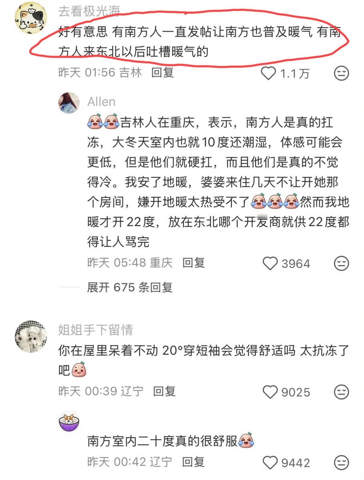 江苏网友发文吐槽:开东北第一晚直接崩溃了。通篇读下来,不是嫌东北室外冰天雪地,而是嫌人家室内暖气开的太足了,是热到哭了的那种,是长毛狗都要热到抢救的那种…… 这下好了,北方网友和南方网友就在评论区吵了起来。 先是北方网友阴阳怪气的表示:好有意思,有南方人一直发帖让南方普及暖气,现在又有南方人到东北旅游吐槽暖气太热。 南方网友也是不甘示弱:0°怎么就不能睡觉啦,评论区真的是越看越夸张。 …… 我想说的是:人家就在平台上发了一个吐槽的帖子,大家有必要如此的阴阳怪气呢?各地都有不同的生活习俗,这种生活习俗是经年累月养成的,短的几十年、长的可能是几百上千年了,就比如吃辣,有些地方无辣不欢,有些地方却是见到辣椒会望而却步。大家为什么要想当然,要把自己的生活习惯强加到他人身上呢? 就这个话题,大家是什么看法?