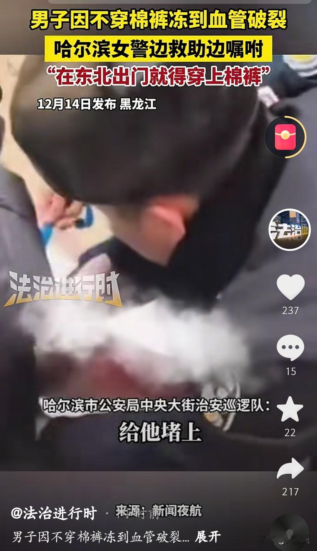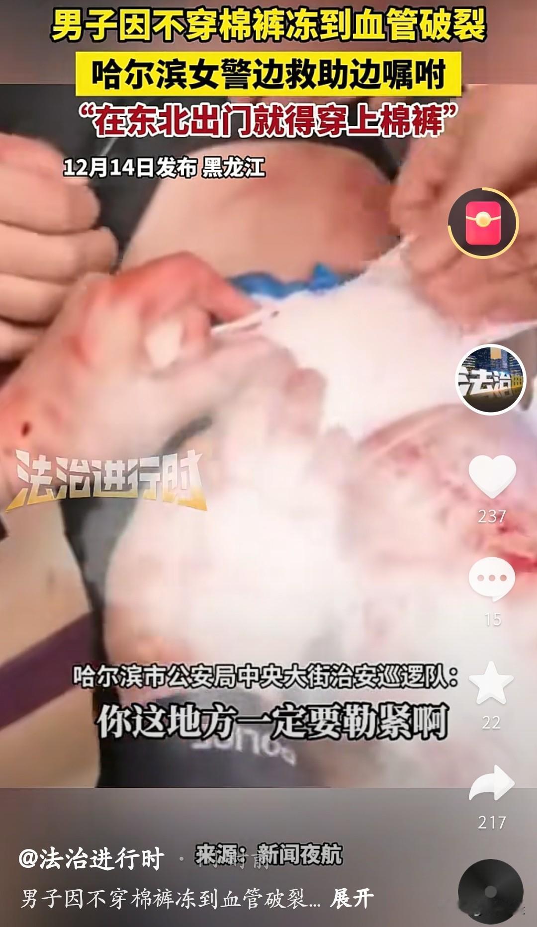 还敢冬天不穿保暖裤吗?哈尔滨这位大哥可算栽了跟头!就因为出门嫌麻烦没穿棉裤,直接冻到血管破裂,疼得站都站不稳,还好被中央大街巡逻的女警遇上了。 女警一边麻利地帮他处理伤口、用纱布勒紧止血,一边忍不住念叨念叨:“在东北出门就得穿棉裤,这可不是闹着玩的!” 看着大哥疼得龇牙咧嘴的样子,隔着屏幕都觉得冷得慌。 东北的冬天零下几十度,冷风跟刀子似的往骨头缝里钻,别仗着年轻就硬扛,冻伤、血管出问题都是实打实的风险。咱该穿的保暖装备一点都不能省,棉裤、羽绒服安排上,暖和比耍帅重要多了,可别学这位大哥遭这份罪!
