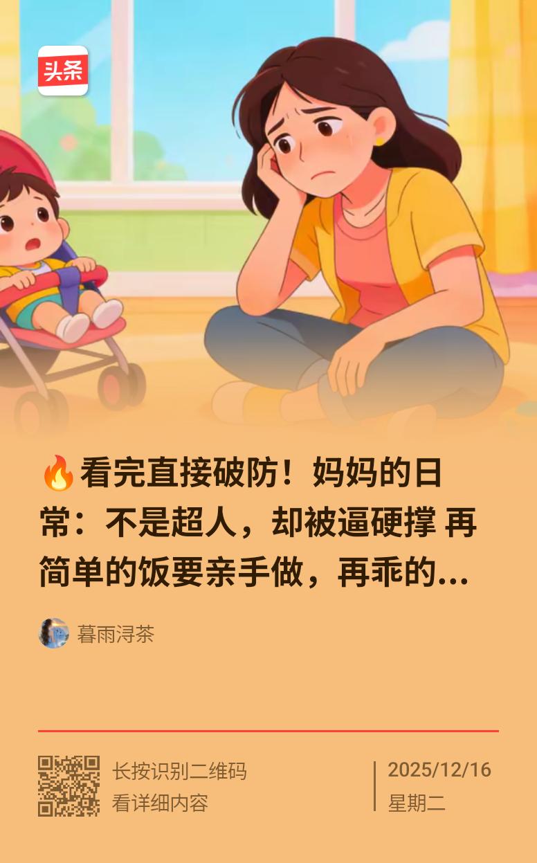 当妈之后才发现,原来再厉害的人也会累到撑不住! 凌晨三点多,孩子突然烧到39度,小脸红扑扑的,小手摸起来烫得吓人,我抱着他在客厅里来回走,怎么哄都不退烧。卧室里传来老公均匀的鼾声,那一刻心里突然咯噔一下——婚姻里最难受的,不是他在外面有别的心思,而是我累得快站不住的时候,他却睡得那么安稳。 家里那些看不见的活儿,就像空气中的灰尘,你不主动收拾,它就一直都在。马桶圈上没擦干净的尿渍、沙发缝里滚得到处都是的袜子、冰箱里放了好几天过期的酸奶……这些碎碎叨叨堆在一起,比天天加班还让人喘不过气。更气人的是,孩子乖的时候就夸“随爸爸,这基因真好”,一哭闹就变成“肯定是妈妈没教好”。 记得有一次我急性肠胃炎,蹲在马桶边吐得直不起腰,两岁的女儿跑过来,用小手轻轻拍着我的背,奶声奶气地说:“妈妈不哭,我给你擦眼泪。”那一刻眼泪突然就下来了——原来我们不是天生就这么能扛,只是被那句“妈妈”逼着不得不长大。 当妈这几年,多少妈妈都是在深夜偷偷崩溃,第二天又笑着面对孩子?那些说不出口的委屈,最后都变成了朋友圈里仅自己可见的动态。你家那位爸爸,是“猪队友”还是“神助攻”呢? -search.byteimg.com/img/labis/0c8c7546f342e861365c7d8c3e1bd5e4~480x480.JPEG