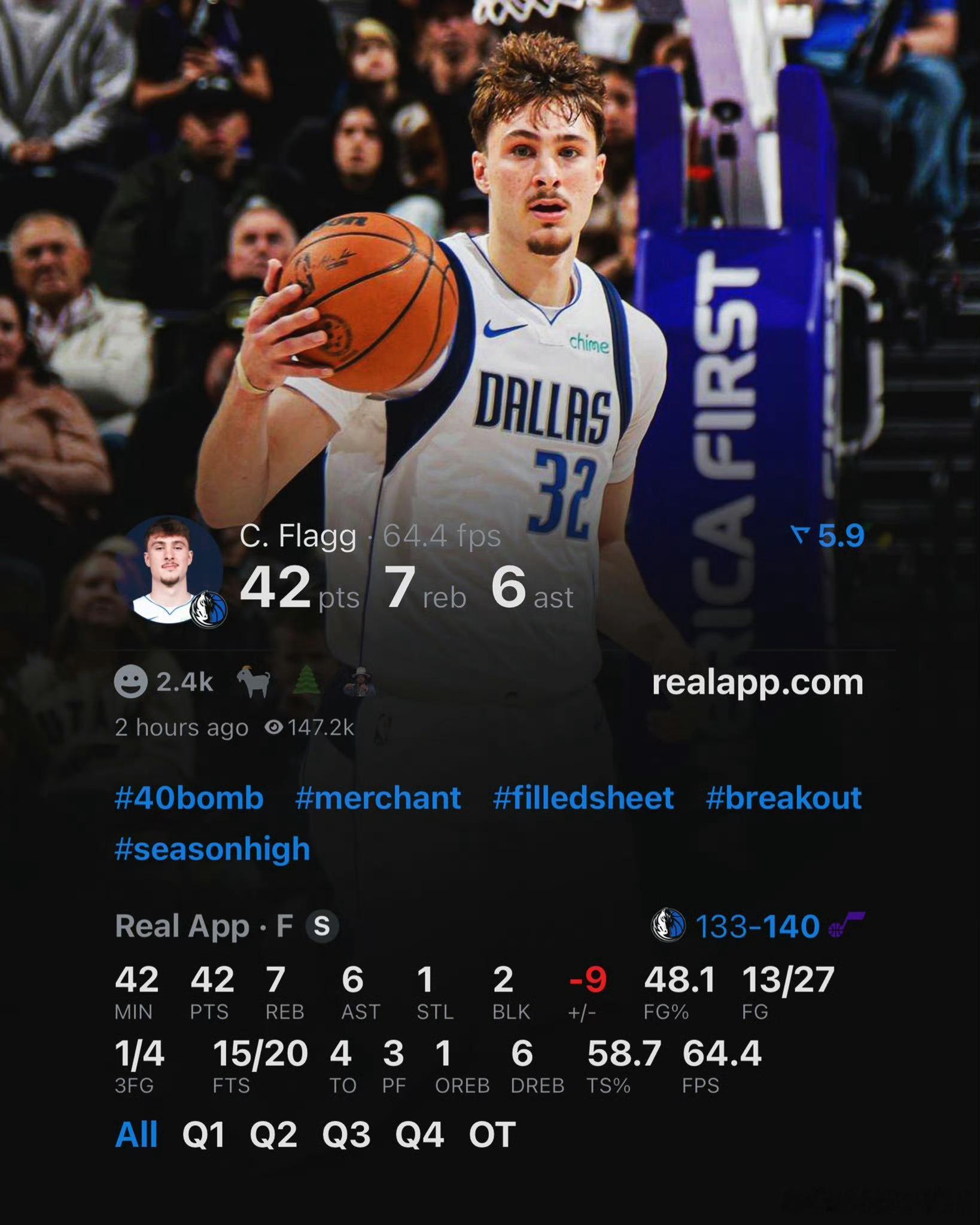 原来美国之子弗拉格才18岁!照他目前来看,今年最佳新秀估计还是他的!克努佩尔危机了!自他从从控锋转成锋线之后,真的越打越好了,完全没有之前那股水劲!现在应该没有人说他水了吧!难怪ESPN排了在25岁以内的球星排名,他能排在第八位!实至名归!今天弗拉格拿下42分,创造了NBA中18岁球员单场得分纪录,超越的是詹姆斯在 2003 年18岁时创下的 37 分的纪录。 弗拉格半场24分4篮板4助攻,9中7,这已经是他第三次半场20+,历史第1、2、4年轻的半场20+都属于弗拉格。另外他在19岁之前已经拿到461分,超越麦迪升至历史第三,第二的科比539分,第一詹姆斯625分,弗拉格在19岁之前还有2.5场比赛。他在近8场比赛的表现如下:打爵士——42分7篮板6助攻打篮网——22分5篮板8助攻打火箭——19分5篮板3助攻打雷霆——16分2篮板2助攻打热火——22分6篮板2助攻打掘金——24分8篮板2助攻打快船——35分8篮板2助攻打湖人——13分7篮板11助攻目前场均18.4分6.3篮板3.5助攻1.3抢断三项命中率三分最差,只有25%!目前他已经距离新秀榜的第一名只差0.6分!按照他这么打下去,新秀榜第一估计还得是他的!詹姆斯弗拉格独行侠最佳新秀