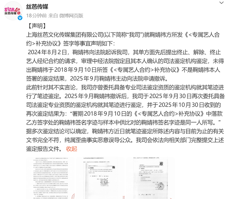 丝芭晒笔迹鉴定报告丝芭否认伪造鞠婧祎签名 发声明否认伪造鞠婧祎签名,称据多次鉴定结论可以确定,鞠婧祎方近日就笔迹鉴定所陈述内容与目前为止的有关文书完全不符,纯属歪曲事实恶意误导公众。我司会依法向相关部门完整提交上述鉴定报告文件。