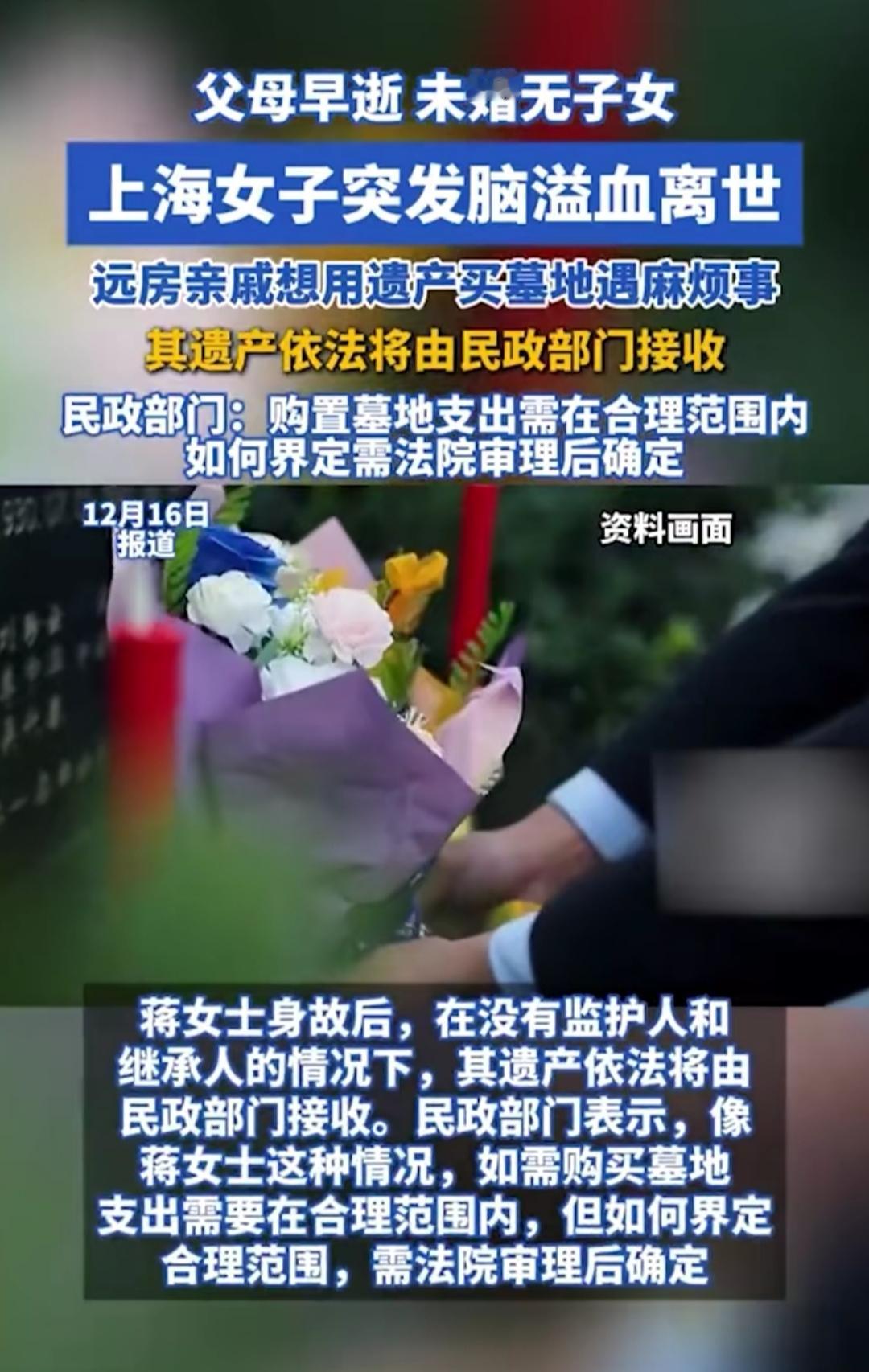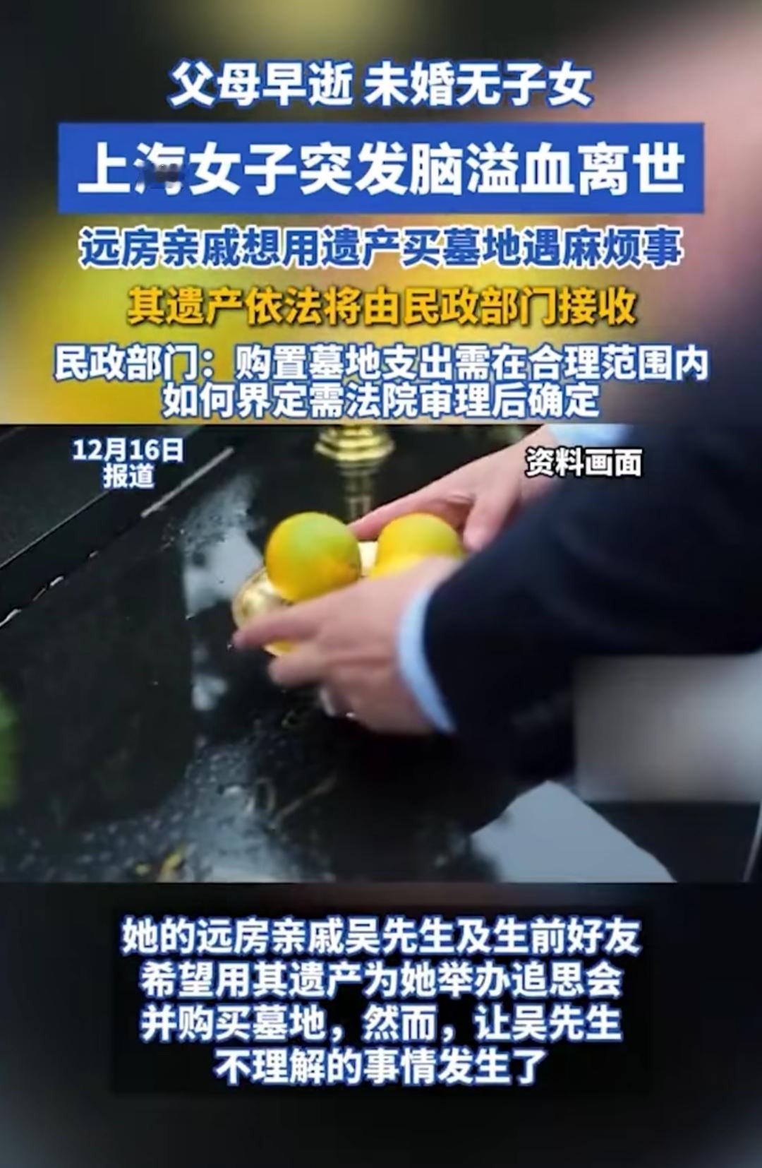 谁能想到,46岁的蒋女士突发脑溢血离世后,最棘手的不是告别,而是没人能顺利用她的遗产为她办场体面的葬礼?父母早逝、未婚无子女,她的身后事,难住了好心帮忙的亲戚和朋友。 蒋女士的人生过得不算孤单,有同事紧急送医,有远房亲戚签字垫付医药费,还有好友惦记着让她入土为安。可真到动用遗产时,却卡在了“合理支出无明确标准”上——想买墓地、办追思会,却因她无监护人和继承人,遗产要归民政部门,后续还得有人承担墓地维护费。 这场看似特殊的纠纷,其实藏着很多独身人士的隐忧。我们总以为日子能慢慢过,却忘了意外可能突如其来。蒋女士的遭遇提醒我们:无论是独身还是有家人,提前做好规划、明确意定监护,不是悲观,而是给人生留一份体面,给在乎的人少添一份麻烦。愿每个认真生活的人,都能被世界温柔以待,身后事也能如己所愿。