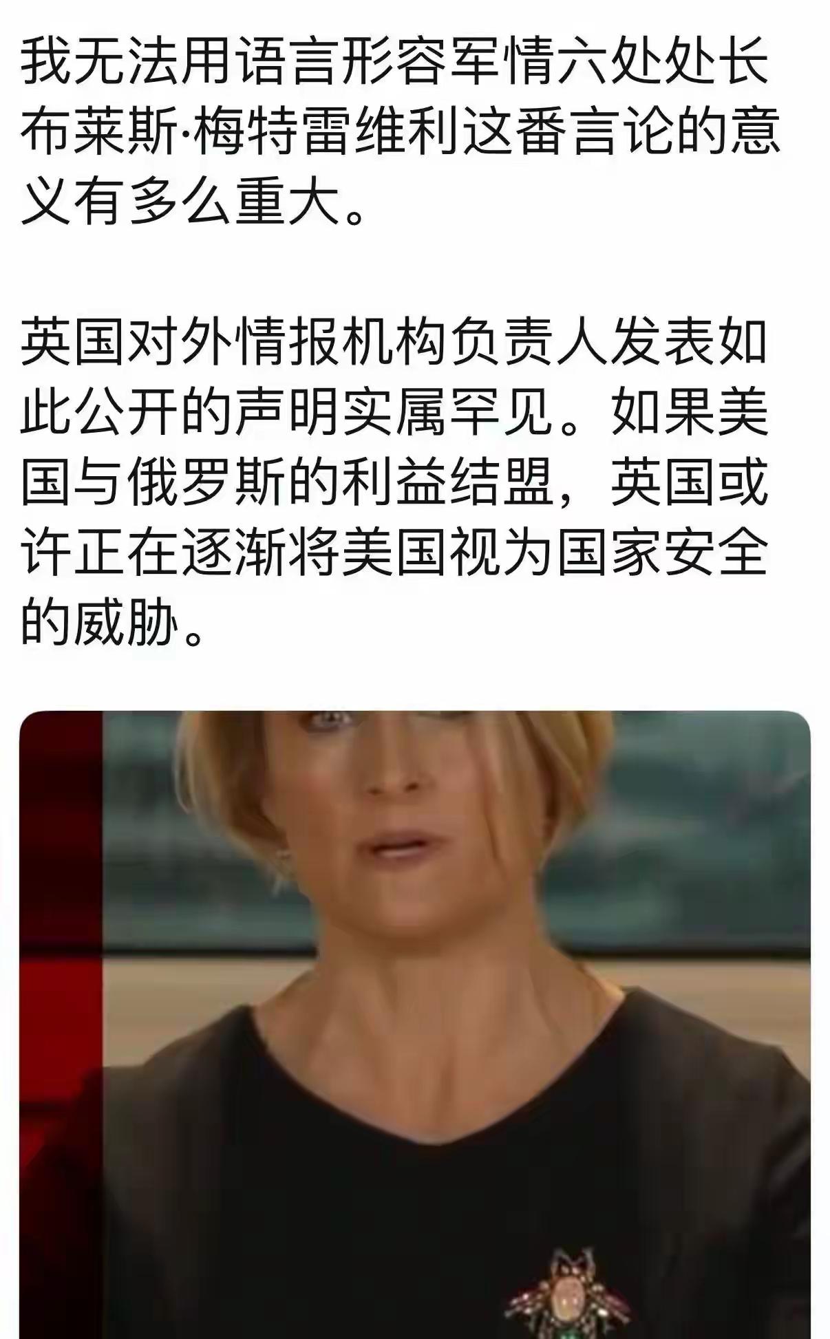 美国与俄罗斯结盟,老狐狸英国最先看到这一点。 英国军情六处处长布莱斯·梅特雷维利罕见表态,如果美俄结盟,英国将视美国为安全威胁! 千万不要小瞧这个处长,她掌管的军情六处可是让全球恐怖组织和邪恶政权闻风丧胆的存在。这次处长敢公开叫板美国,气场直接拉满。 而她也是军情六处116年来首位女性掌门人,能坐到这个位置,靠的就是在高压地缘政治中摸爬滚打的硬实力。 英国虽然实力早已不复当年,但它总能抢先一步看到别人没看到的,这就是它活跃在国际社会的能力,毕竟它是最狡猾的老狐狸。