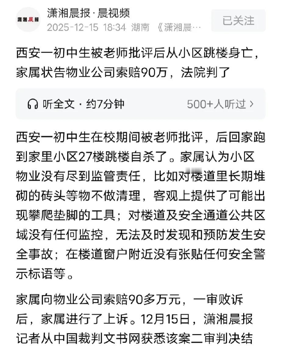 陕西西安,初一学生在学校被老师批评后,跑回家冲到小区27楼,纵身一跃,当场身亡,事后,该老师被开除、校长被免职,学校还赔了家长一笔钱,可家长认为,物业也需要承担责任,理由是:楼道里有4块砖头,成为孩子垫脚石,而且公共区域没有监控未能及时发现并阻止,旁边也没有任何安全警示标语,向物业索赔90多万。最终,法院判决出人意料。 2023年12月7日晚上,已经7点20分,可小军却迟迟没回到家,这可把他父母急坏了。 小军妈妈赶紧联系老师,问老师他是不是被留堂了? 老师告诉小军妈妈说,学校早就放学了,学生们都早已经回家。 小军父母又问了小军几个要好的同学,大家都说没有看到小军,一种不祥的预感涌上心头,小军父母赶紧出门找。 他们到处找,到处喊都没有看到小军,他们担心小军出事,赶紧报警。 就在小军父母报警后不久,小区物业管理员在单元楼门口右侧发现了小军的尸体。 小军父母看着已经离去的孩子悲痛欲绝,他们不知道孩子怎么这么突然就没了。 后来,民警通过调查监控发现,小军从学校回来后推着自行车进入电梯,他家本是在5楼,但他却直接上了27楼,之后从27层楼道的窗户坠落身亡。 2023年12月14号,西安市公安局莲湖分局出具一份《调查意见告知书》,里面写道:2023年12月7号小军被发现死亡,警方调查后确定,这起死亡事件不是刑事案件。 后来家长经过了解,事发当天,小军在学校上课时不知道是看课外书还是玩手机,被老师训斥了几句,一时想不开才做傻事。 这件事发生后不久,训斥小军的老师就被开除了,校长也被免职处理,学校为了安抚小军父母,给他们赔偿了一笔钱。 可小军父母认为,小军的死物业也应该承担责任。 首先,楼道里堆了好久的砖头、杂物之类的东西,物业从来不管不问,也不清理,这些东西就摆在那儿,客观上等于给想攀爬的人提供了垫脚的工具,存在很大安全隐患。 其次,不管是楼道里,还是安全通道这种公共区域,物业连个监控都没装,就算有人在这些地方有危险举动,也根本没法及时发现,更别说提前预防事故发生了。 最后,楼道里的窗户旁边,连一句安全警示标语都没有,既没提醒大家注意安全,也没起到警示危险的作用,物业完全没尽到提醒义务。 所以,小军家属把物业公司给告了,他们提出了几个要求,一是让物业公司赔偿死亡赔偿金89万多块钱;二是让物业公司再赔5万块钱的精神损失费;三是这起官司的诉讼费,得由物业公司来承担。 对此,物业公司辩称,砖头是其他业主放置的,常常是他们清理过后不久,又有人放过去。 一审法院审理认为,小军虽然是未成年人,但已经年满12岁,有一定的辨别能力,知道自己行为的后果。楼道堆砖头和他的死亡没有直接关系,所以不支持家属让物业公司赔偿的要求。 家属不服,提起上诉,二审法院审理认为,物业公司的安全保障义务有特定适用场景,小军是主观上选择轻生,楼道没贴警示标语、有砖头、电梯能到高层、没装监控这些情况,和他轻生身亡没有法律上的直接因果关系,最后驳回了家属的上诉,维持原判。 从情理层面看,这起悲剧首先是一个家庭无法承受的重创,十二岁的孩子因被老师批评选择轻生,父母痛失爱子,其悲痛与绝望完全值得共情。 他们将情绪与追责指向物业公司,本质上是在巨大的创伤中试图为孩子的离世找到一个“出口”,哪怕这份指向带着非理性的执念,也藏着为人父母的不甘与心碎。 站在家属的视角,楼道砖块、无监控、缺警示标语等细节,都成了他们眼中“本可以避免悲剧”的遗憾点。 如果物业清理了杂物、装了监控、贴了警示,或许孩子就不会轻易走到顶楼,或许能被及时发现阻止。 这种“如果式”的联想,是悲痛下对“微小改变可能扭转结局”的执念,无关法律因果,只关乎情感上的自我慰藉。 而从物业和客观现实角度,要求物业通过常规管理完全杜绝轻生行为,确实超出了合理职责边界。 物业的安全保障义务聚焦于防范意外、维护公共秩序,而非预判并阻止个体的主观轻生选择。 十二岁孩子的轻生决定,根源更多与情绪调节、心理抗压能力相关,无法简单归咎于物业的管理疏漏。 情理的天平一边是家属的情感诉求,一边是客观的责任边界,悲剧的核心终究是未成年人心理健康的缺失,这远比追责更值得反思。 根据《民法典》第1198条规定,宾馆、商场、银行、等经营场所、公共场所的经营者、管理者或者群众性活动的组织者,未尽到安全保障义务,造成他人损害的,应当承担侵权责任。 因第三人的行为造成他人损害的,由第三人承担侵权责任。 经营者、管理者或者组织者未尽到安全保障义务的,承担相应的补充责任。 本案中,小军的死亡系其主观意志主导的轻生行为,并非物业未尽安全保障义务直接导致。 楼道砖块、无监控、缺警示标语等情况与死亡结果无法律上的直接因果关系,物业已履行合理范围内的管理义务,所以,法院依据该法条驳回了家属的索赔请求。