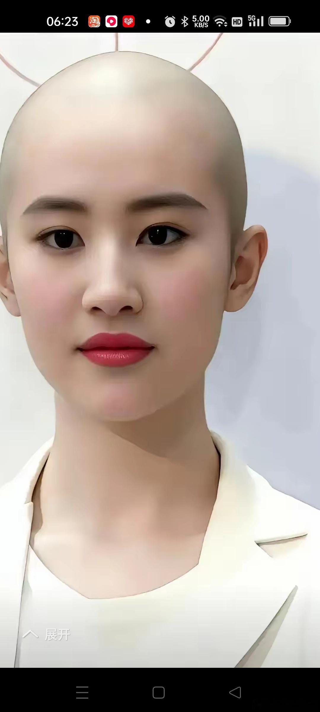 刘亦菲也真的是拼了。为了拍片把自己的头剃成了光头。那么一头乌黑秀丽的头发瞬间就没有了,真的很佩服她的勇气,一直是以优雅端庄的形象出现在众人面前。突然间剃了一个光头,还有点不习惯。真不敢相信那么爱美的一个人,所以为了剧情的需要剃光头,真的实在是太敬业了。说实话,她的光头也挺好看的,整个头型圆润饱满,没有一点瑕疵的地方,这也是我见过最好看的美女光头了。她的颜值真的太抗打了,真的是360度无死角!神仙姐姐太美了!