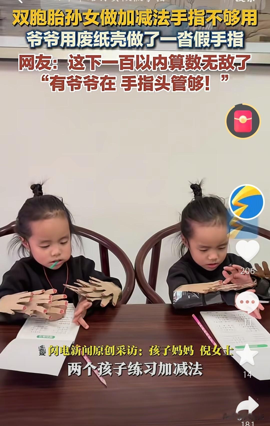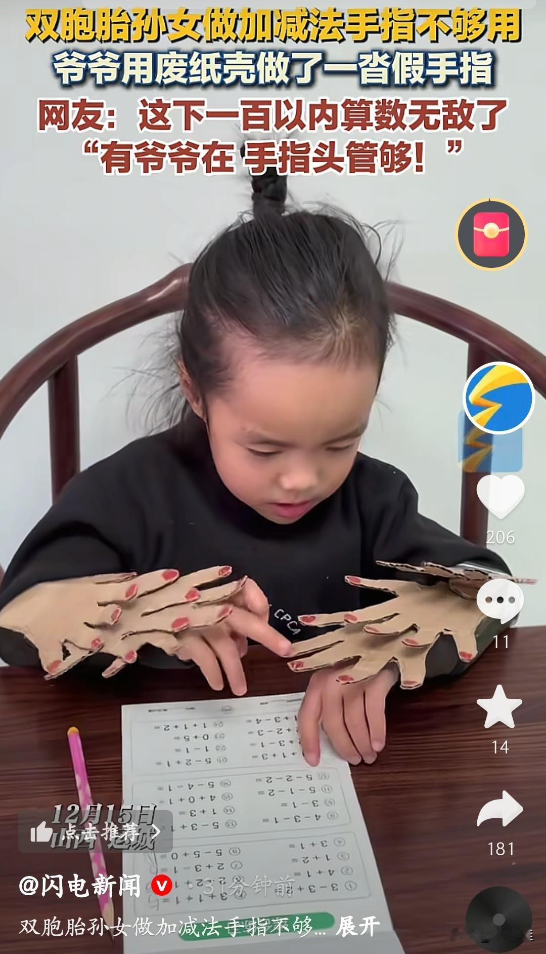 太费爷爷了!双胞胎孙女练加减法总喊手指不够用,爷爷二话不说,翻出家里的废旧纸箱,裁裁剪剪、粘粘贴贴,愣是做出一沓纸壳假手指。小丫头们把纸壳手指套在手上,数着“指头”算算术,别提多认真了。 爷爷坐在桌边忙活的样子,老花镜凑得近近的,一点点修边、固定,满桌子的纸壳碎片,全是对孙女的疼爱。这下一百以内的算数,俩娃算是“装备拉满”了,有爷爷在,手指头管够!其实这是爷爷把对孙女的爱,都揉进了这小小的纸壳手指里啦。
