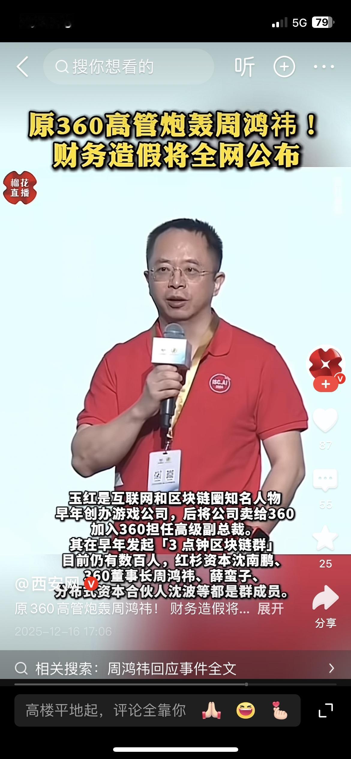 赶紧看!原360高管手撕周鸿祎,创投人别踩这坑! 之前找项目怕遇财务造假的朋友注意了!权威渠道明确说,12月16日原360相关公司高管玉红,在朋友圈和社群怒撕周鸿祎,称帮其做假账超几十亿,游戏业务全是造假,还说握有实锤数据。 可360火速发声明否认,说玉红14年入职、15年就离职,从没任核心管理层,言论全是恶意诋毁!说实话,咱创投圈、互联网人合作时,别白跑冤枉路,三步避坑超简单: 1. 第三方机构深度尽调; 2. 企查查+行业数据平台交叉验证; 3. 合同写清财务造假追责条款。 这事儿一边有指控一边有辟谣,你觉得后续会爆出实锤吗?评论区聊聊~