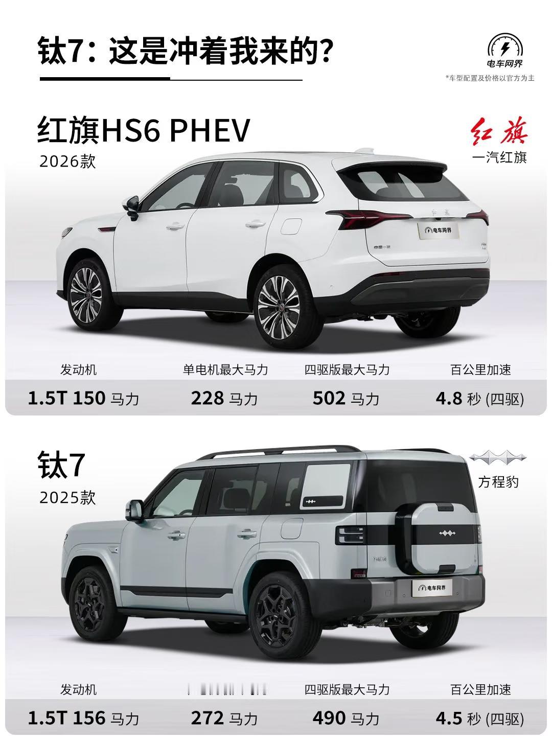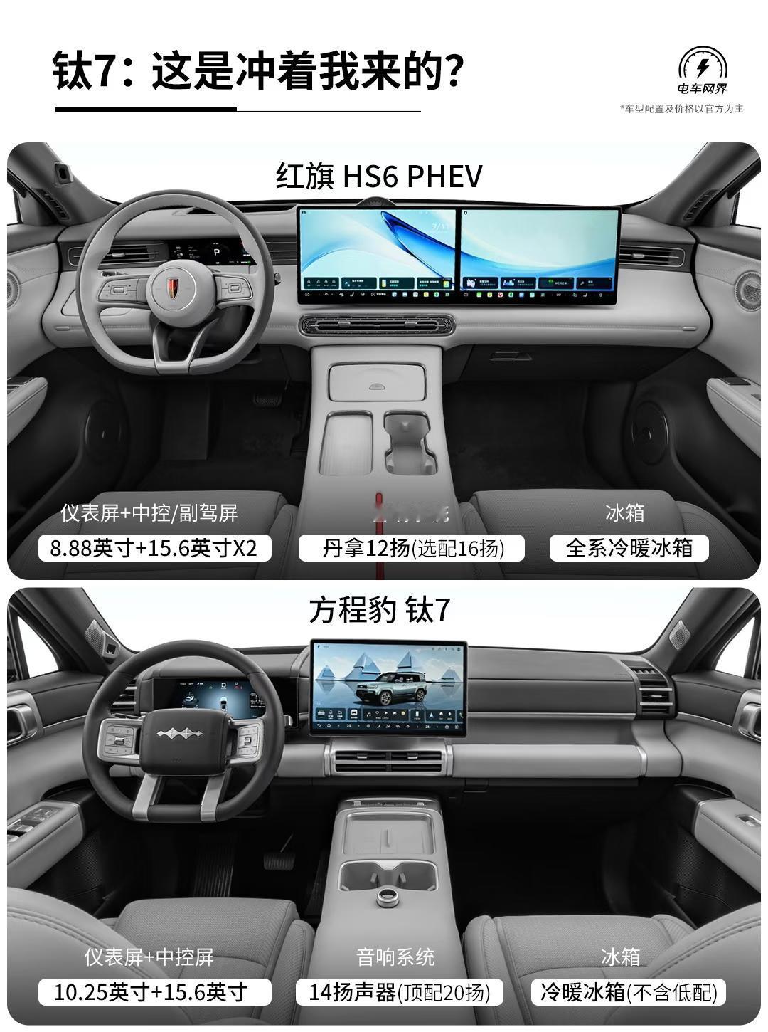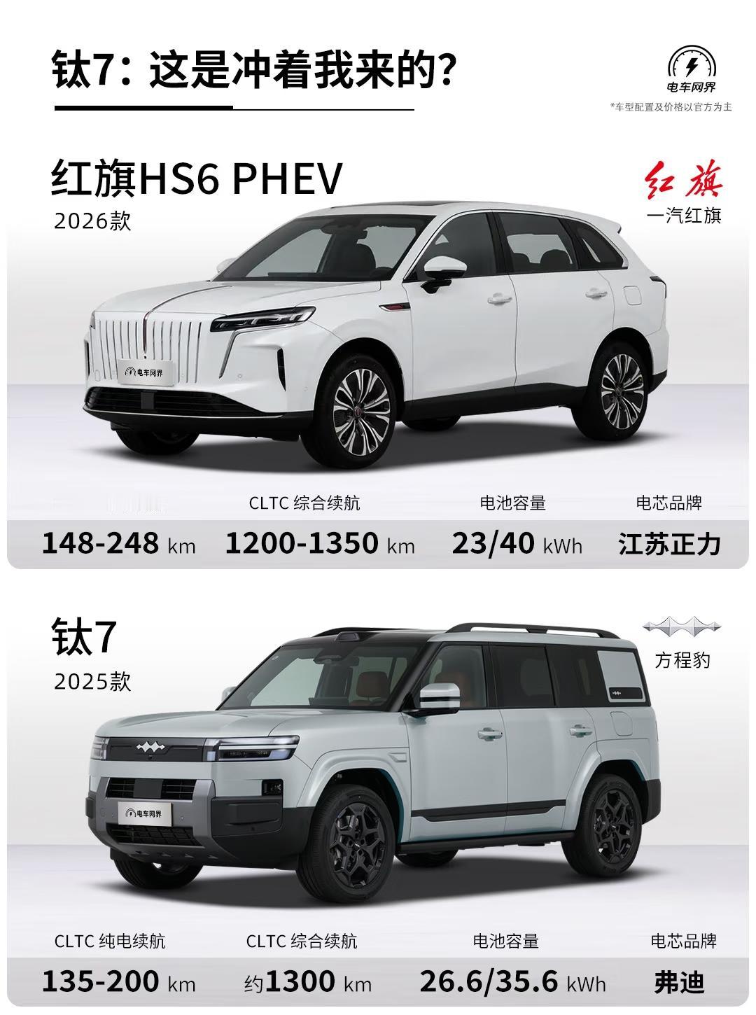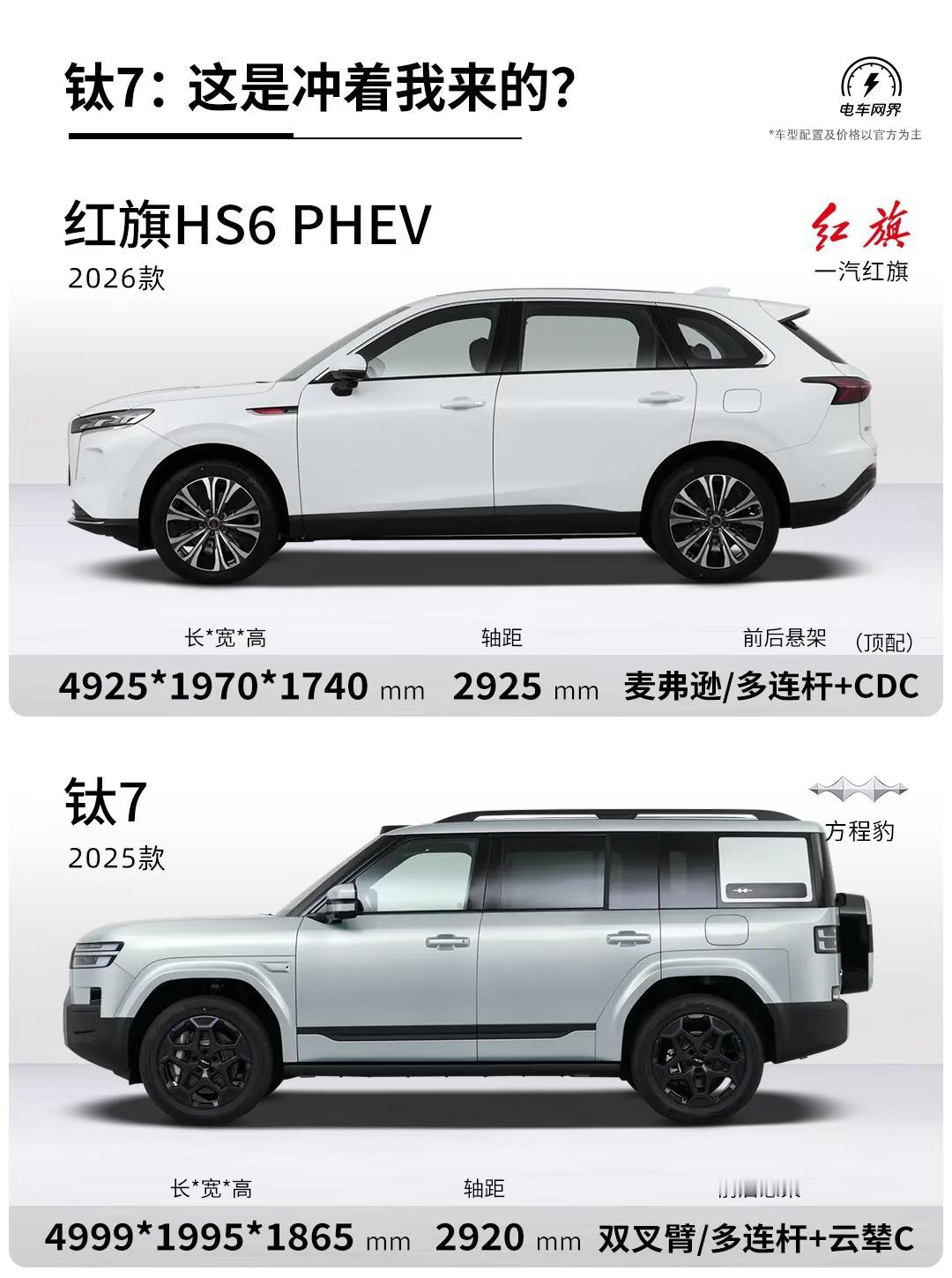 就红旗HS6号PHEV还要舔着脸来跟比亚迪方程豹钛7 对比,你除了双联屏比比亚迪大,起售价低1000块,还有什么能比啊。 方程豹钛7可是方程豹家一人扛起家族销量的爆款,红旗HS6号PHEV哪哪都差点,再说你也不是方盒子啊,非要说方程豹钛7是针对你。