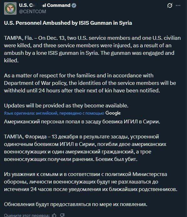 机枪伸进窗户,扫射正在会面的美军与叙利亚军官 !12月13日,“在叙利亚,一名‘伊斯兰国’武装分子发动伏击,造成两名美国军人和一名美国文职人员死亡,另有三名军人受伤。袭击者参与交火后被击毙。”在美军在叙利亚遇难后,特朗普承诺将对“伊斯兰国”作出“非常严厉”的回应。 《华尔街日报》 12月13日这事儿发生在叙利亚中部帕尔米拉,美军和叙利亚安全部队正在那儿搞联合行动,主要针对伊斯兰国残余势力。美军中央司令部说,一名独行枪手发动伏击,导致两名美国士兵和一名平民翻译死亡,另外三名美军受伤。袭击者很快在交火中被击毙,美方把这定性为伊斯兰国干的。 巴沙尔·阿萨德去年下台后,叙利亚新政府上台,美国跟他们关系缓和了不少。上个月,叙利亚临时总统艾哈迈德·沙拉还访问白宫,双方谈合作打击伊斯兰国,叙利亚正式加入美国主导的反恐联盟,美国也部分解除对叙制裁。但伊斯兰国虽然丢了地盘,潜伏分子还在沙漠地区活动,帕尔米拉这地方本来就乱,政府控制不稳。 袭击那天,美军士兵在为高层会晤提供警戒,一名美国军官跟叙利亚内政部官员在楼里讨论反恐协调。枪手利用地形靠近,突然开火。美军和叙利亚部队马上反击,把人干掉。伤员被直升机送到坦夫基地治疗,美军还出动战斗机在帕尔米拉上空飞一圈,扔照明弹显示存在感。 特朗普很快就表态,说这是针对美国和叙利亚的伊斯兰国袭击,会采取非常严厉的回应。他在社交平台发文,哀悼三名遇难美国人,还说叙利亚总统对这事儿很生气。国防部长皮特·希格西斯也发话,骂袭击者野蛮,警告谁敢动美国人,下场很惨。 叙利亚方面,内政部发言人说袭击者在安全部队服役过,但没领导职位,正在查他跟伊斯兰国有没有联系。叙方也伤了人,但没细说。伊斯兰国还没认领,但美方坚持是他们的人干的。有些报道提到这可能算内部袭击,因为枪手背景复杂。 这事儿是阿萨德倒台一年后,美军在叙利亚第一次死人。上次致命袭击是2019年在曼比季的爆炸。美国在叙利亚还有上千部队,主要在东北部和坦夫,帮训练当地力量,防伊斯兰国死灰复燃。袭击暴露了沙漠地带安全隐患,联合行动风险不小。 调查还在进行,美军说会继续跟叙利亚合作反恐。特朗普强调不会放过伊斯兰国,估计后面会有针对性行动。整个事件提醒大家,中东这块儿就算政权换了,极端势力威胁还在,合作反恐路还长着呢。