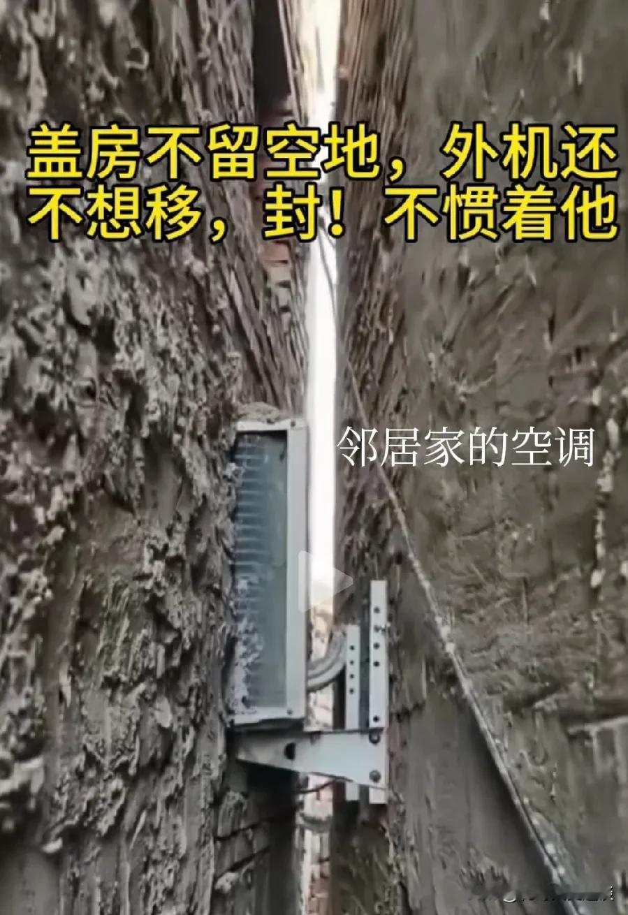 男子盖房不留空地,空调不挪,邻居直接封死。男子盖房子不留一点空间,但是他外面还安