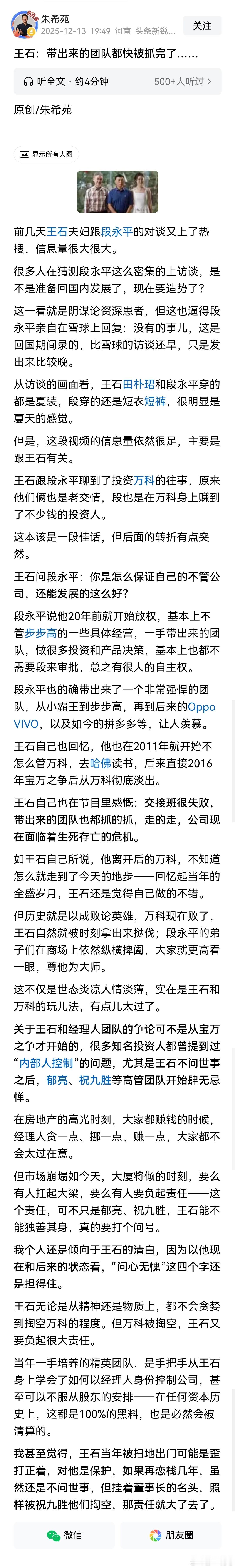 王石:带出来的团队都快被抓完了……王石自己在节目里感慨:交接班很失败,带出来的团队也都抓的抓,走的走,公司现在面临着生死存亡的危机。关于王石和经理人团队的争论可不是从宝万之争才开始的,很多知名投资人都曾提到过“内部人控制”的问题,尤其是王石不问世事之后,祝九胜等高管团队开始肆无忌惮。当年一手培养的精英团队,是手把手从王石身上学会了如何以经理人身份控制公司,甚至可以不服从股东的安排——在任何资本历史上,这都是100%的黑料,也是必然会被清算的。王石当年被扫地出门可能是歪打正着,对他是保护,如果再恋栈几年,虽然还是不问世事,但挂着董事长的名头,照样被祝九胜他们掏空,那责任就大了去了。