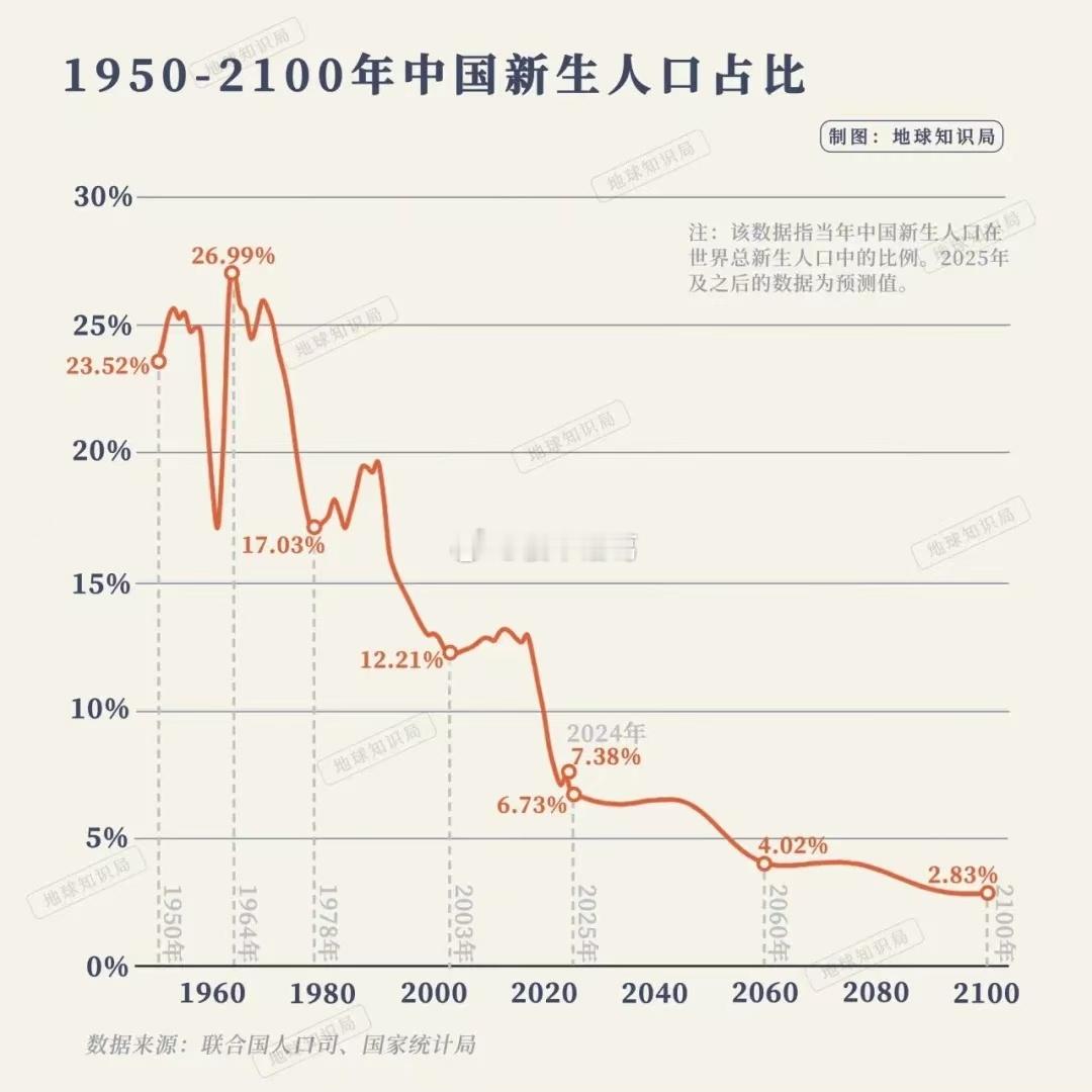 联合国人口司预测:2025年中国新生人口数量预计是871万多,占全世界新生人口比例,已跌破7%…