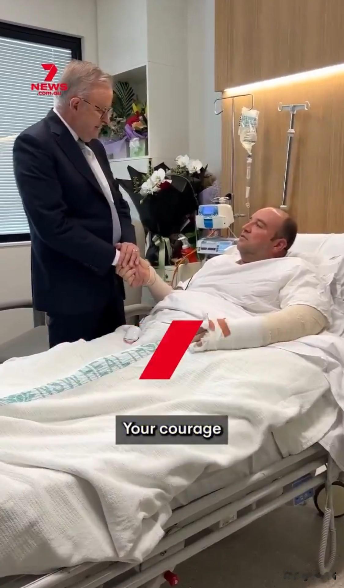 澳大利亚总理安东尼·阿尔巴尼斯前往医院探望了邦迪海滩英雄艾哈迈德·艾哈迈德。总理在社交媒体上发文写道:“艾哈迈德,你是澳大利亚的英雄。你冒着生命危险拯救他人,在邦迪海滩上冲向危险,解除了一名恐怖分子的武装。我谨代表所有澳大利亚人,向你致以最诚挚的谢意。” 在邦迪海滩枪击案中受伤的制服枪手英雄艾哈迈德·艾哈迈德早些时候在医院接受采访,表达了自己的病情,并请求母亲为他祈祷。艾哈迈德用阿拉伯语向关心他的人们致以慰问。土耳其新闻机构TRT World在社交媒体上分享了这段视频,视频中他用阿拉伯语说道:“我请求我最疼爱的母亲为我祈祷。母亲,请为我祈祷。”他接着说:“如果真主保佑,我的伤势应该不严重。”