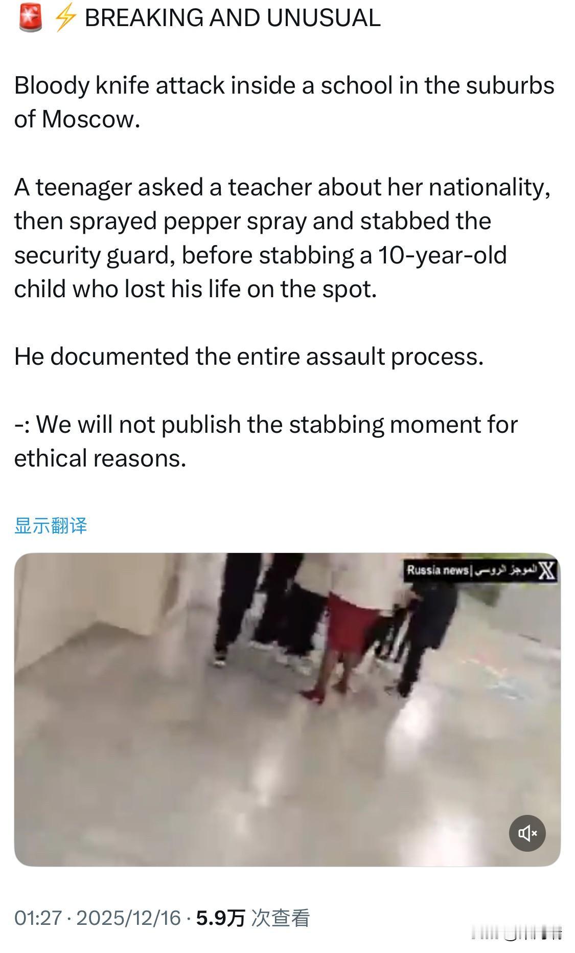 突发事件:俄罗斯莫斯科郊区一所学校发生血腥持刀袭击事件。 一名青少年询问老师的国籍,然后喷洒辣椒喷雾并刺伤保安,之后又刺伤一名 10 岁儿童,导致该儿童当场死亡。 作案者是一名九年级学生,身穿一件印有“生命毫无价值”字样的衬衫,并展示了一个名为“Kolovrat”(太阳符号)的异教符号。 凶手(15岁)是一名新纳粹分子。 这名青少年崇拜澳大利亚极端分子布伦顿·塔兰特,并且拥有一顶印有极端主义口号的头盔。 他最初计划先杀害一名数学老师,然后再袭击一名 10 岁儿童。