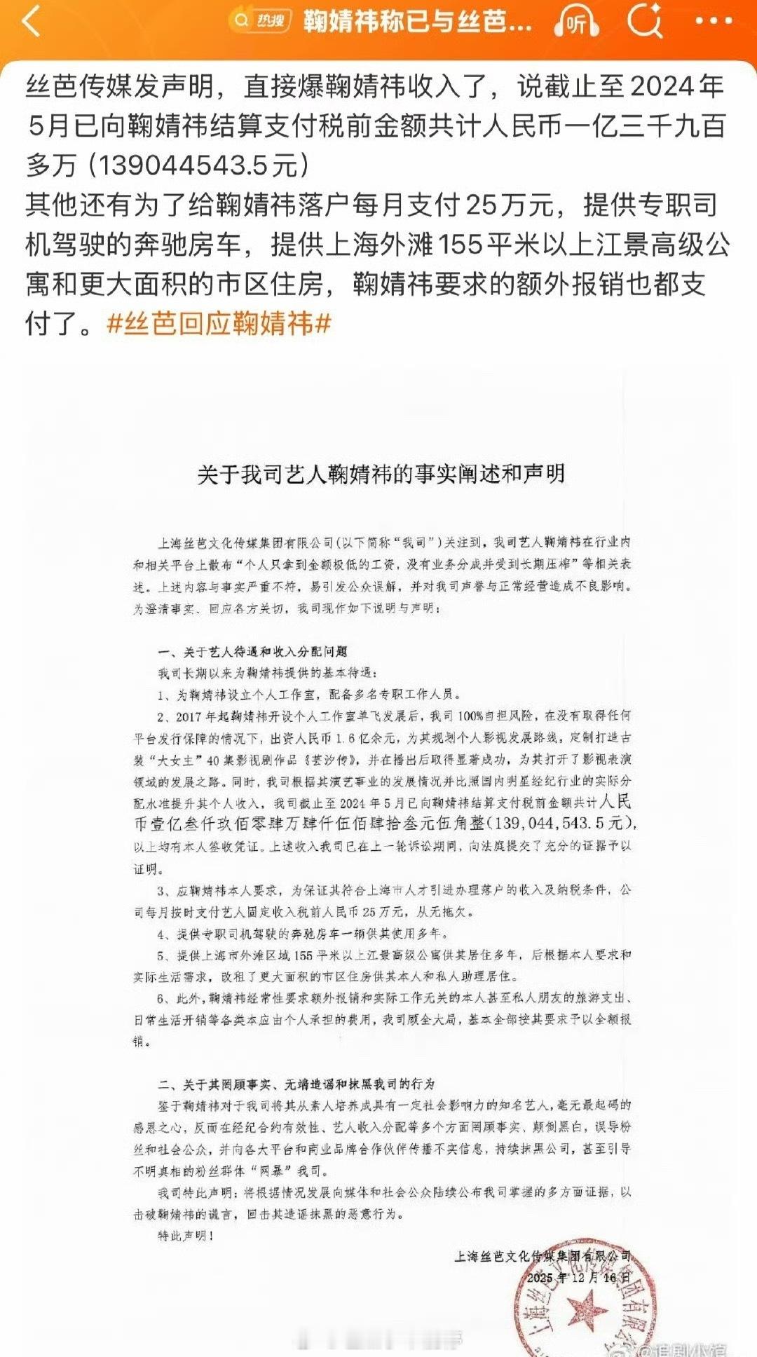 丝芭称已支付鞠婧祎超1.39亿丝芭po出了结算给鞠婧祎的收入待遇,称截止24年5月之前一共给鞠婧祎打了一亿三千万多的结算款,“将根据情况发展向媒体和社会公众陆续公布我司掌握的多方面证据,以击破鞠婧祎的谎言。”