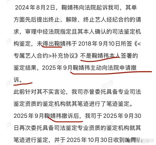 鞠丝与其说丝芭造假不如说鞠婧祎大概率是在情况不明朗的时候脑子一懵被哄着签了她不太了解的补充协议,毕竟补充协议是在2018年,我是不信应对过这么多解约违约情况的公司会搞出伪造文件这么烂的把戏 去年11月鞠方也说要做字迹鉴定刚丝芭发的声明里说得很清楚,在法院指定且鞠婧祎本人确认的司法鉴定机构做了鉴定,得出结果是“不能得出不是鞠婧祎本人”,今年10月又做了一次鉴定,鉴定结果是本人签署丝芭敢这么直接发,造假可能性等同于零 丝芭回应鞠婧祎