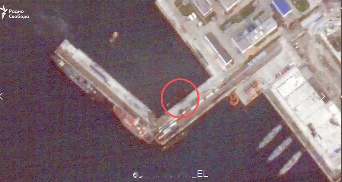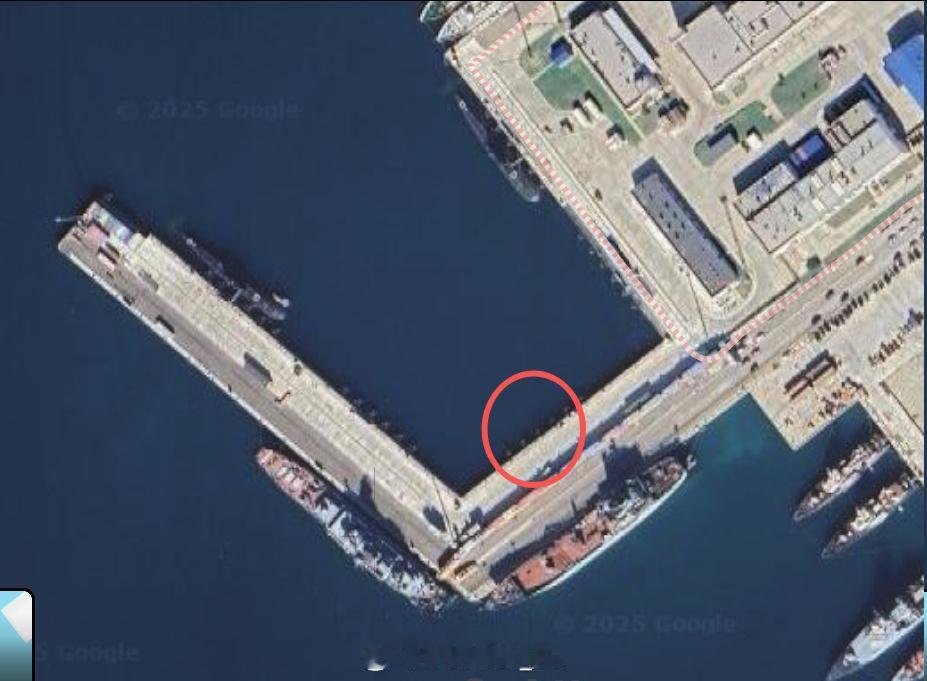西方媒体发布了俄罗斯新罗西斯克军港遭到乌军自爆潜航器袭击前后的卫星图像,可以看到码头拐角处有明显对受损痕迹(图2),但停泊在这里的几艘俄军潜艇的位置没有改变。俄罗斯黑海舰队随后发布了一段视频,称新罗西斯克军港遭遇乌军自爆潜航器袭击的俄军潜艇并未受损。对比乌方发布的袭击视频以及卫星图像,可以确认就是距离爆炸点最近的这艘潜艇(图4)。不过个人觉得这个视频本身的说服力并不够,没有拍摄到卫星图像显示的码头受损明显的位置,无法确认拍摄时间是否在袭击后;其次,潜艇的水下结构是否受到破坏,视频中是无法验证的。