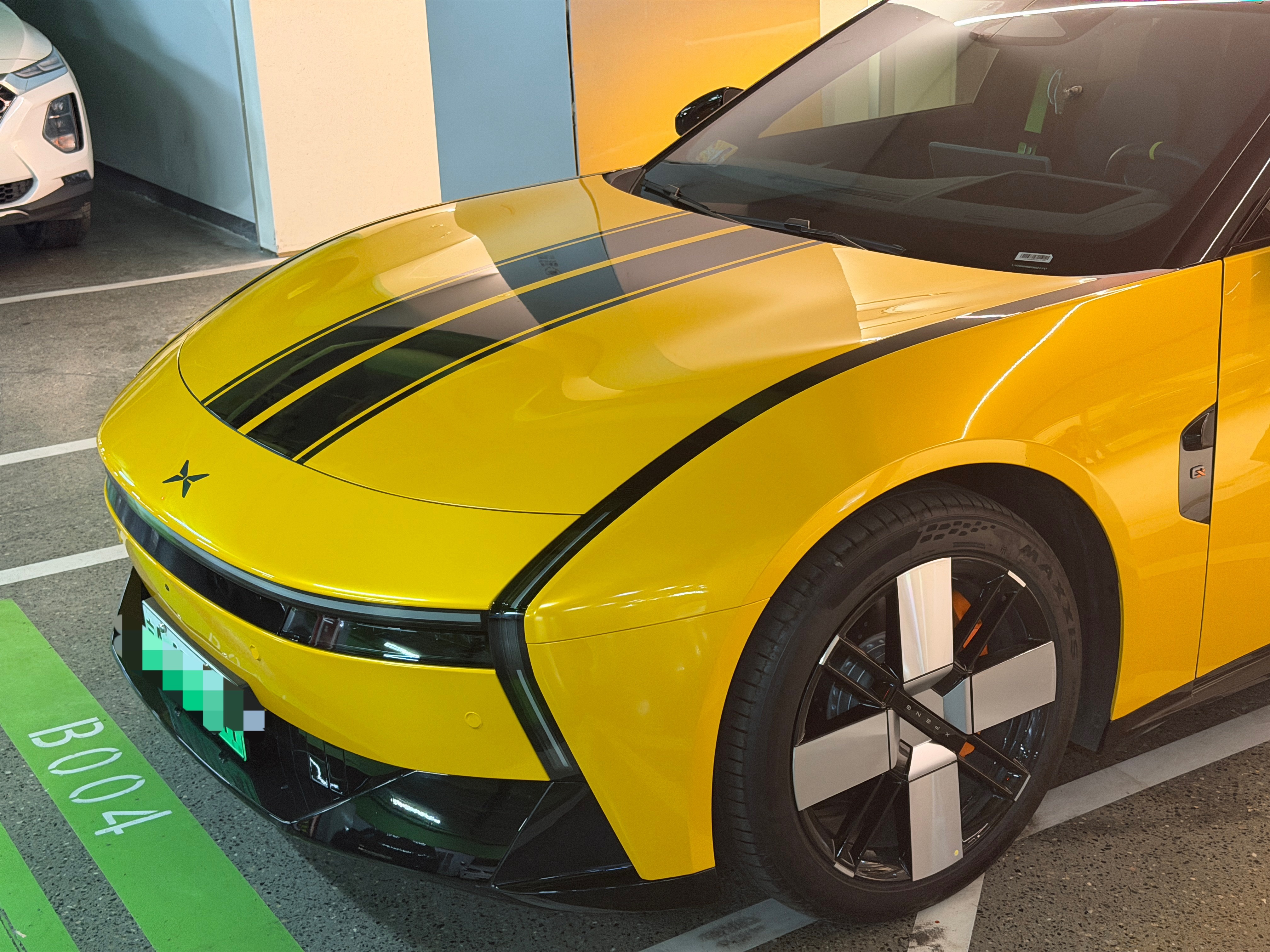 来吃饭碰到一小鹏P7,四驱版改改了个拉花,这黄色确实很有跑车那味儿啊!