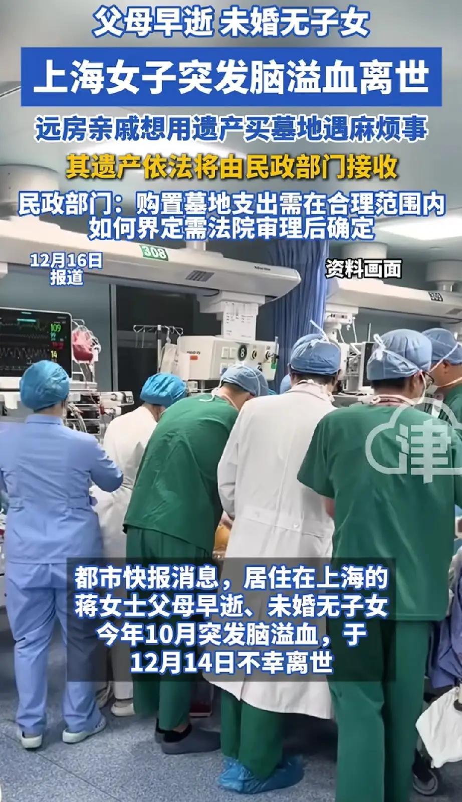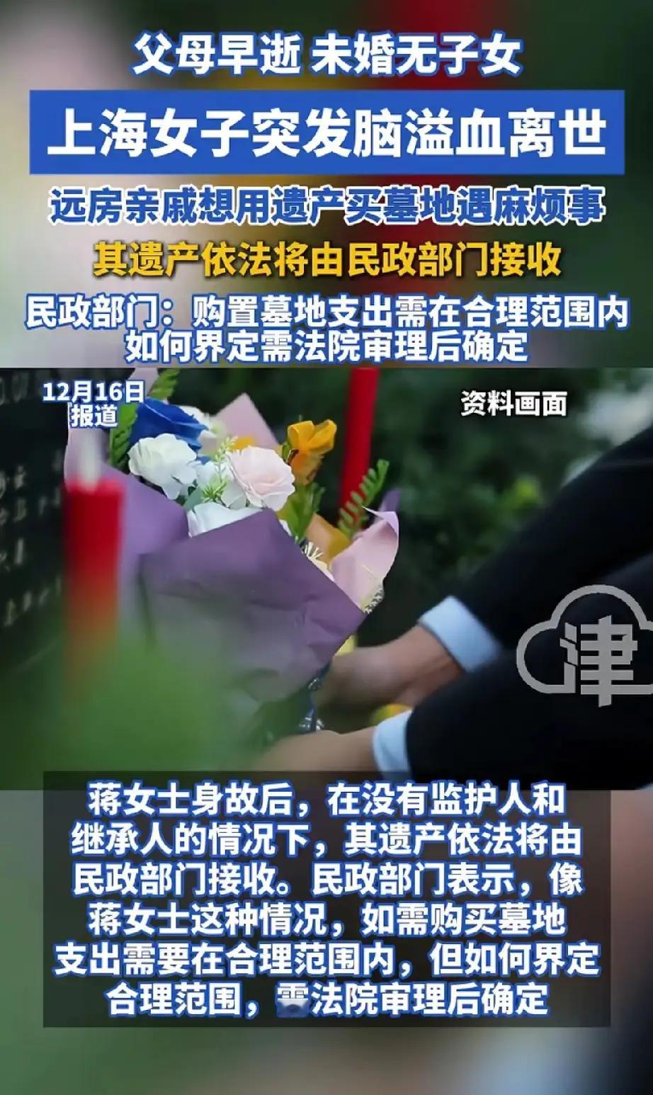 10月,上海一名46岁女子突发脑溢血,于12月14日离世。她父母早亡,自己未婚且无子女,也未留下遗嘱。其远房亲戚打算用她的遗产为她购置一块墓地。 我有孩子,将来我死了也不需要墓地,有买墓地的钱,还不如替我去做善事,帮助有需要的人,这才是为了积德。[大笑] 她的财富应给她的亲戚和朋友,有一个算一个,最后平分,她的最后一笔钱,有亲戚和朋友给她办后事。 太突然了,其实在中国没有后人应该提早卖房子卖地,做养老和后事安排。 一个无子无女的光棍买什么墓地,远房亲戚的建议真是多余! 不重要了的,现在的人不婚不育不就是今朝有酒而已,不会考虑以后。。。