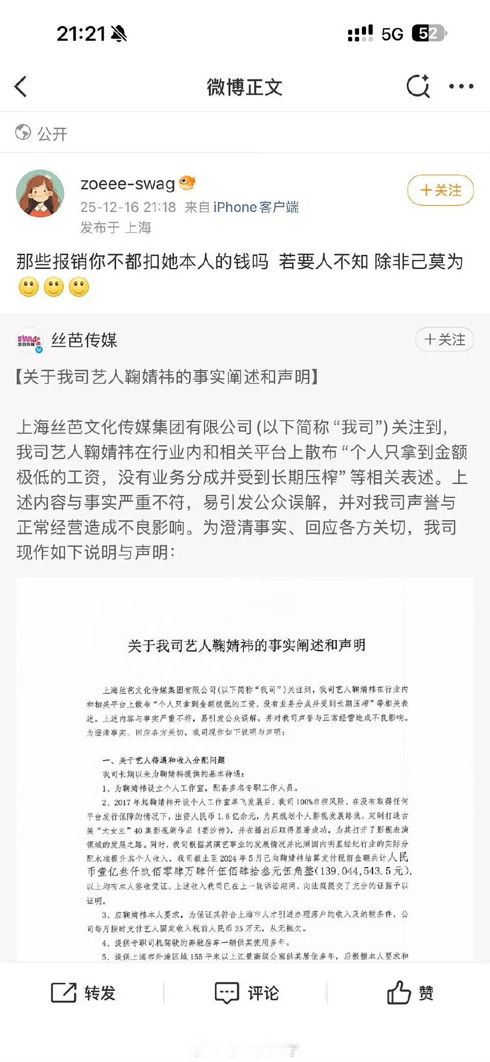 鞠婧祎前助理发文:那些报销你不都扣她本人的钱吗?若要人不知除非己莫为别的不说,能让前助理站出来为鞠婧祎发声,说明鞠婧祎人不错丝芭称已支付鞠婧祎超1.39亿