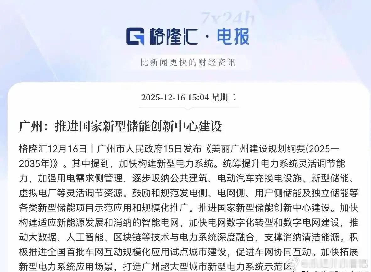 利好总是在盘后!!!一、这一板块迎来利好催化!!!广州发布《美丽广州建设规划纲要(2025—2035年)》,核心聚焦新型电力系统构建,明确推进国家新型储能创新中心建设,统筹吸纳新型储能、虚拟电厂、电动汽车充换电设施等灵活调节资源,鼓励全场景储能项目推广,同时推动大数据、AI、区块链与电力系统融合,打造超大型城市新型电力系统示范区,利好新型储能、虚拟电厂、智能电网、车网互动及电力数字化产业链。二、受益概念股Top20梳理1. 穗恒运A:广州本地能源国企,布局锂电、飞轮、全钒液流电池等储能技术,在建31个储能项目总容量373MWh,2GWh储能智造中心投产,深度受益广州新型储能创新中心建设。2. 广州发展:广州市属综合能源平台,覆盖电力、燃气、储能等业务,中标广州电网储能调频项目,新能源及储能业务毛利率超54%,是本地新型电力系统建设核心标的。3. 梅雁吉祥:参股广东吉洋能源布局飞轮储能,广州地铁18号线飞轮储能项目已挂网试验,技术获国家发改委认可,契合广州轨道交通储能场景需求。4. 国电南瑞:电力自动化龙头,虚拟电厂调度平台接入23个省级电网,2025年前三季度电力自动化营收186亿元,AI与电网调度融合技术支撑广州智能电网建设。5. 阳光电源:全球光储市占率超20%,“光伏+储能+调频”方案适配新能源消纳,海外户储订单增长,为广州新型电力系统提供光储一体化解决方案。6. 宁德时代:全球储能电池出货量第一,587Ah储能专用电芯循环超12000次,2025年三季度储能营收增58%,是广州储能项目核心电芯供应商。7. 东方电子:虚拟电厂全产业链服务商,AI现货价格预测系统误差率低于3%,实施南网首个市场化虚拟电厂项目,适配广州虚拟电厂资源聚合需求。8. 南网储能:南方电网储能平台,运营抽水蓄能与电化学储能电站总装机超12GWh,2025年前三季度储能辅助服务收入增29%,助力广州电网调节能力提升。9. 科陆电子:储能系统集成商,宜春10GWh基地供货国网项目,印尼3GWh基地在建,2025年前三季度净利润增251%,储能业务贡献超60%营收增量。10. 协鑫能科:虚拟电厂零碳服务龙头,接入可调资源超200万千瓦,江苏市场占比30%,其负荷聚合技术可复制至广州车网互动与虚拟电厂场景。11. 金智科技:源网荷储聚合平台服务商,参与长三角虚拟电厂试点,2024年储能系统集成收入增50%,技术适配广州用户侧储能与虚拟电厂建设。12. 许继电气:特高压设备龙头,国内唯一±1100kV换流阀供应商,储能变流器技术领先,为广州智能电网升级提供核心设备支撑。13. 特变电工:新能源并网与输变电龙头,海外EPC覆盖60国,柔性直流输电技术适配广州电网数字化转型,助力新能源消纳。14. 国轩高科:分布式储能标杆,磷酸铁锂电池低温性能领先,德国户储市占率超20%,可为广州工商业储能提供电池解决方案。15. 思源电气:电网智能监测龙头,AI诊断误报率低于0.1%,是国网/南网主供商,技术支撑广州电网安全监测与数字化改造。16. 林洋能源:全球最大智能电表出口商,微电网市占率40%,双向电表与海岛微电网方案适配广州电力需求侧管理。17. 积成电子:电网数字化服务商,国产调度软件市占率30%,数字孪生平台参与国网试点,助力广州电力系统数字化转型。18. 中天科技:海缆与电力传输龙头,500kV海缆技术全球领先,为广州海上风电并网及智能电网提供传输设备支撑。19. 北京科锐:虚拟电厂核心标的,完成能量管理平台技术升级,覆盖新型配电网、储能等场景,其EMS系统可服务广州虚拟电厂调度。20. 科士达:数据中心储能龙头,为阿里云、腾讯云提供光储方案,构网型储能系统毫秒级响应电网波动,适配广州数字电网建设需求。三、总结广州此次长期规划明确了新型电力系统的建设方向,新型储能、虚拟电厂、智能电网成为核心主线,本地能源国企将率先承接项目落地,而具备技术壁垒的储能设备、电力数字化龙头则有望凭借产品与方案优势参与广州市场建设。整体来看,产业链企业将从政策落地、项目招标、技术应用三大维度持续受益,行业迎来规模化发展机遇。