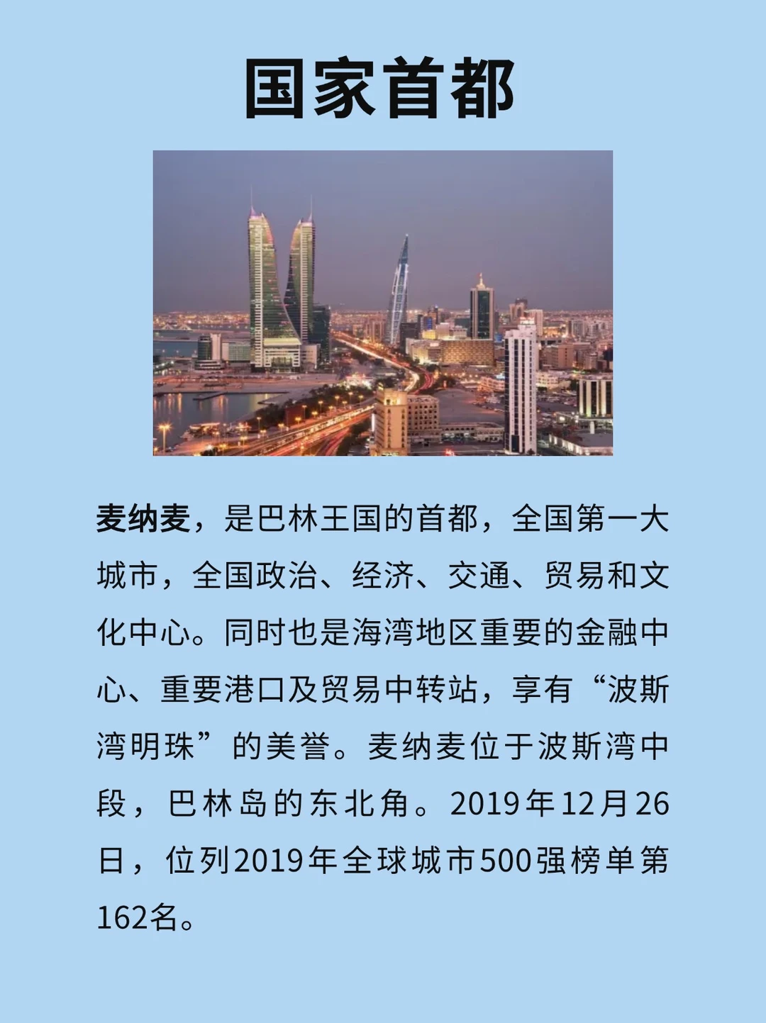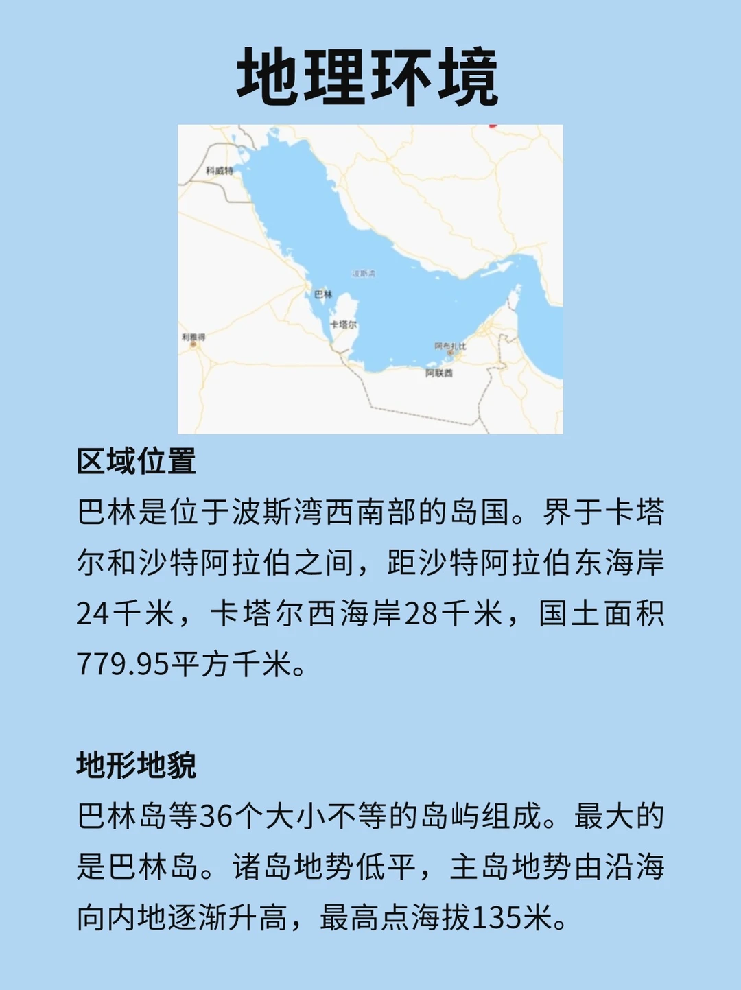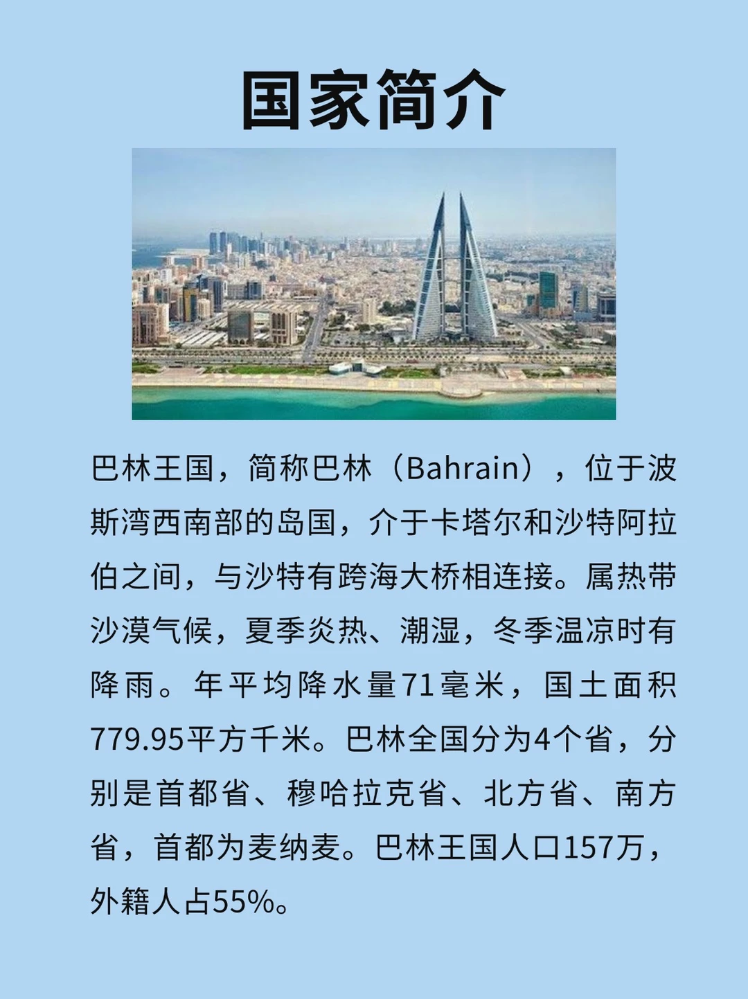 [打卡R]巴林王国,简称巴林(Bahrain),位于波斯湾西南部的岛国,介于卡塔尔和沙特阿拉伯之间,与沙特有跨海大桥相连接。 [彩虹R]属热带沙漠气候,夏季炎热、潮湿,冬季温凉时有降雨。年平均降水量71毫米,国土面积779.95平方千米。 [向右R]巴林全国分为4个省,分别是首都省、穆哈拉克省、北方省、南方省,首都为麦纳麦。巴林王国人口157万,外籍人占55%。