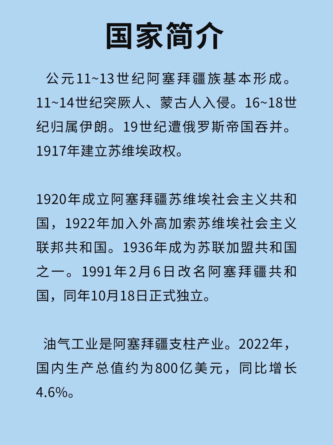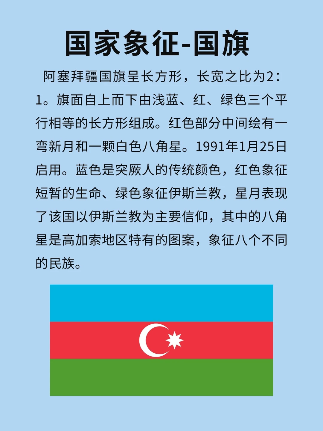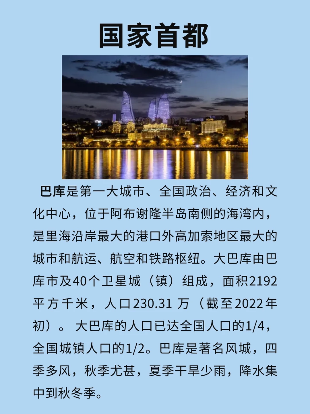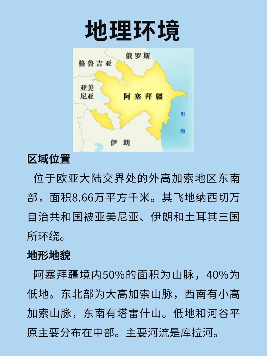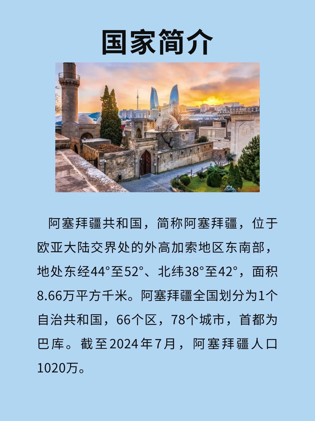 [打卡R]阿塞拜疆共和国,简称阿塞拜疆,位于欧亚大陆交界处的外高加索地区东南部,地处东经44°至52°、北纬38°至42°,面积8.66万平方千米。阿塞拜疆全国划分为1个自治共和国,66个区,78个城市,首都为巴库。截至2024年7月,阿塞拜疆人口1020万。