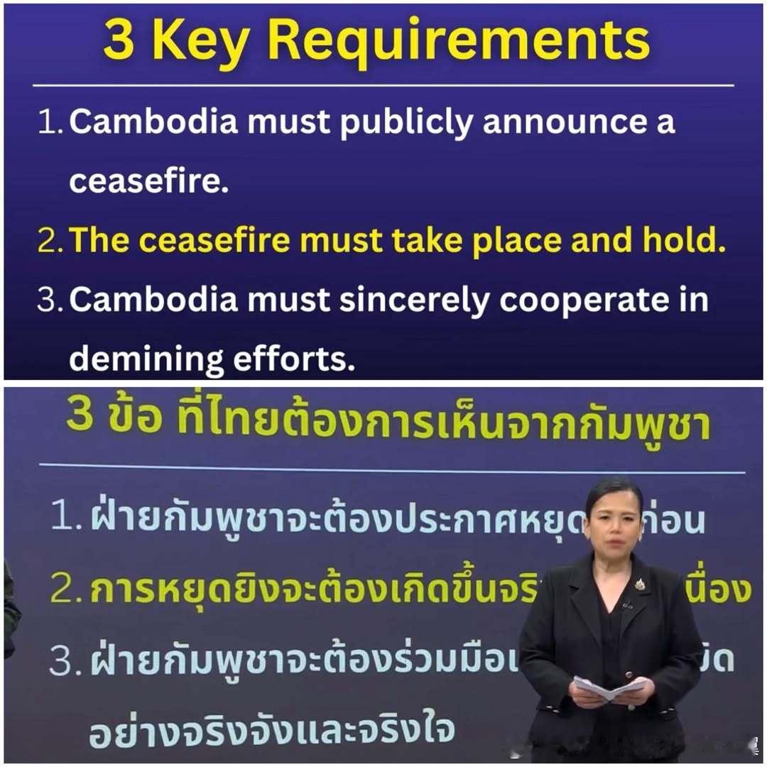 泰柬边境战火再起,泰国外交部对外说明,已就泰柬边境局势提出三项停火前提条件。泰柬冲突泰国提出的三项条件包括,柬埔寨需先单方面公开宣布停火、之后必须持续维持停火状态,并以真诚态度推进边境地区的扫雷行动。2025年5月两国曾发生小规模交火,7月及12月冲突大规模爆发,涉及空袭、导弹袭击以及对基础设施的破坏。冲突已导致双方数十人死亡,数以十万计的平民被紧急疏散,泰国边境部分府县已实施宵禁。