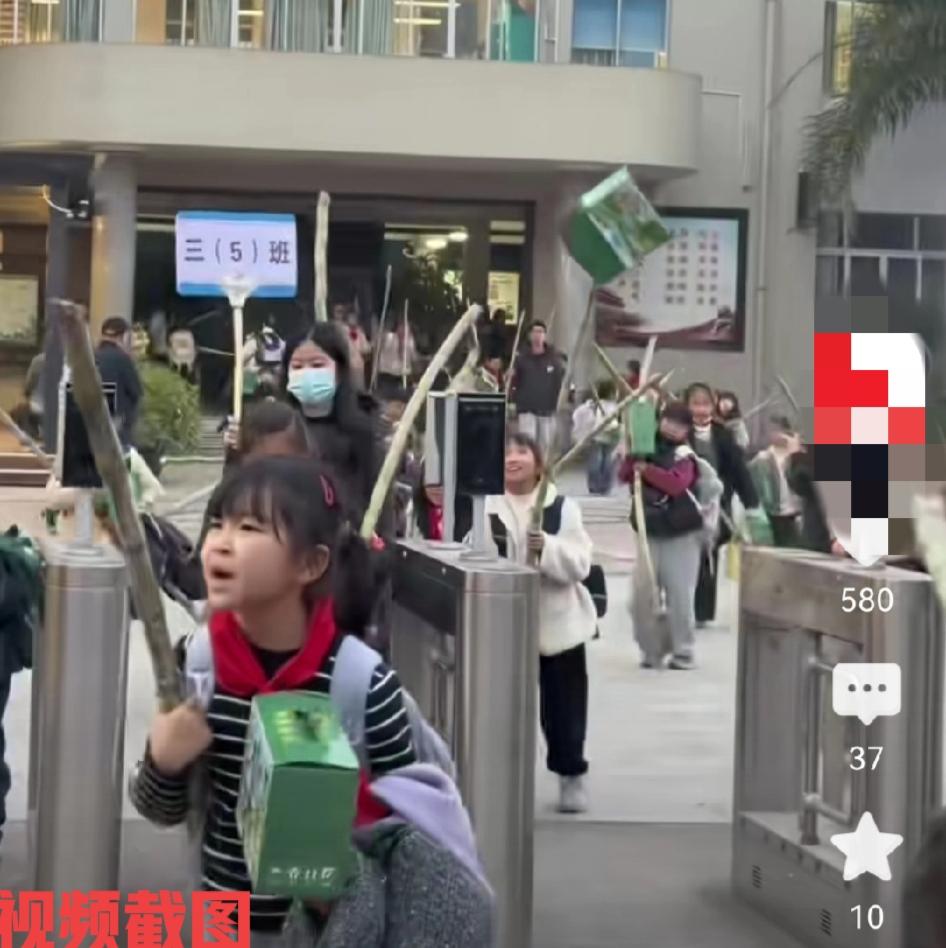 浙江瑞安有学校给学生发甘蔗。 此刻让校门口的一条街,成为最靓的显眼包们荣耀高兴的时刻,因为这里学生出门人人一根甘蔗扛肩头,学生们也特别享受这学校颁发的礼物,看她们笑意的面容就会知道她们心里的高兴。 据说学校颁发了有近两千根甘蔗,还都是这些娃娃学生们自己亲自收割的,如今拿在自己手里,看到不仅是一根甘蔗还有自己在背后的辛勤劳动成果,同学们也是高兴接受这样的馈赠,这里看到了劳动果实的真心喜悦。 想必学校以如此操作也是让同学们体会劳动的过程,让劳动与学习并同,在同学们的生活里增添一点乐趣,还有心情的活跃。 同学们把甘蔗拿回家,肯定是与爸妈说出这是自己的辛勤劳动成果,还会描述自己劳作时的种种现场景象,让爸妈与自己同欢,可见这也是同学们留有的一次深刻记忆,改变她们对待生活学习的态度里有所变化。 小小的一次劳动活动,浸透着学生们的好心情,也看到老师们心存的希望,希望同学们高兴起来,快乐起来,把学习与生活并同做好,让人人有进步。