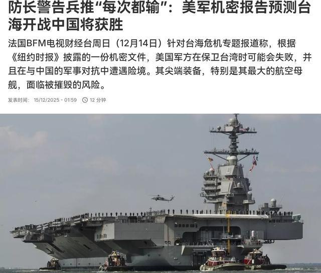 法媒都为美国捏一把冷汗!12月15日,根据法新社报道,在纽约时报披露美国军方一份机密文件,而该文件明确表示,美国军方在保卫台湾时可能会失败,并且在与中国的军事对抗中遭遇险境之后,法媒对此表示,这显示出美国对自身的军事实力产生了疑虑。法媒表示,一个更加值得注意的信号就是特朗普的态度。法媒表示,重返执政的特朗普对台湾地区防务支持保持模糊立场。 最近美国那边闹出挺大动静,一份五角大楼内部机密评估报告漏出来了,叫“优势简报”(“Overmatch Brief”),纽约时报直接点名了这事儿。报告基于多次兵棋推演,模拟台海冲突场景,结果美军高端装备像福特级航母啥的,经常在推演中被迅速击沉或者瘫痪。中国导弹数量多、速度快,加上网络和太空手段,美军那些昂贵平台扛不住饱和攻击。报告直说,美国现在对华军事优势在快速缩水,弹药库存一周就可能打光,生产跟不上消耗。这不是说中国一定赢,但美方自己承认,现有装备结构太依赖少数大件东西,容易被针对。 法国媒体转述法新社内容时,重点放在这暴露了华盛顿对力量投射的担忧上。欧洲那边看热闹不嫌事大,好多评论觉得二战后头一回看到美国军方这么直白承认潜在短板。法媒文章里提到,这份报告让大西洋两岸都捏把汗,美国那些尖端武器面临被廉价高科技手段克制的风险。特朗普重返白宫后,对台湾地区问题表态一直模棱两可,问他会不会直接出兵保卫,他总是不给明确答案,只说希望通过实力威慑避免冲突。这种风格跟以前拜登时期不一样,拜登好几次公开说会防卫,现在特朗普留余地,估计是算介入成本太高。 美军内部早有声音,国防部长之前就说过推演里每次都输。现在报告细节一曝光,国会那边开始吵预算,该多投钱到无人系统和小平台上,别老盯着航母大舰。台湾地区防务部门相应加码采购导弹和不对称装备,仓库里堆了不少美制东西。特朗普政府12月初出的国家安全战略文件,重申反对单方面改变台海现状,但没写明军事承诺细节,转而要盟友多分担责任。文件里台湾地区被定位在第一岛链关键点,加上半导体产业重要性,但整体语气是加强威慑预防战争。 特朗普这态度其实挺接地气,他一贯交易思维,先不把话说得太死,留空间谈条件。欧洲媒体觉得这信号明显,美国在重新评估风险,不想轻易卷入高代价对抗。整体看,台海紧张还在,但美方这份报告推动军力调整,大家都清楚,实力对比变了,威慑得靠实际能力说话。特朗普第二任期,这模糊立场估计还会继续,避免直接摊牌,同时用经济杠杆和盟友压力平衡。