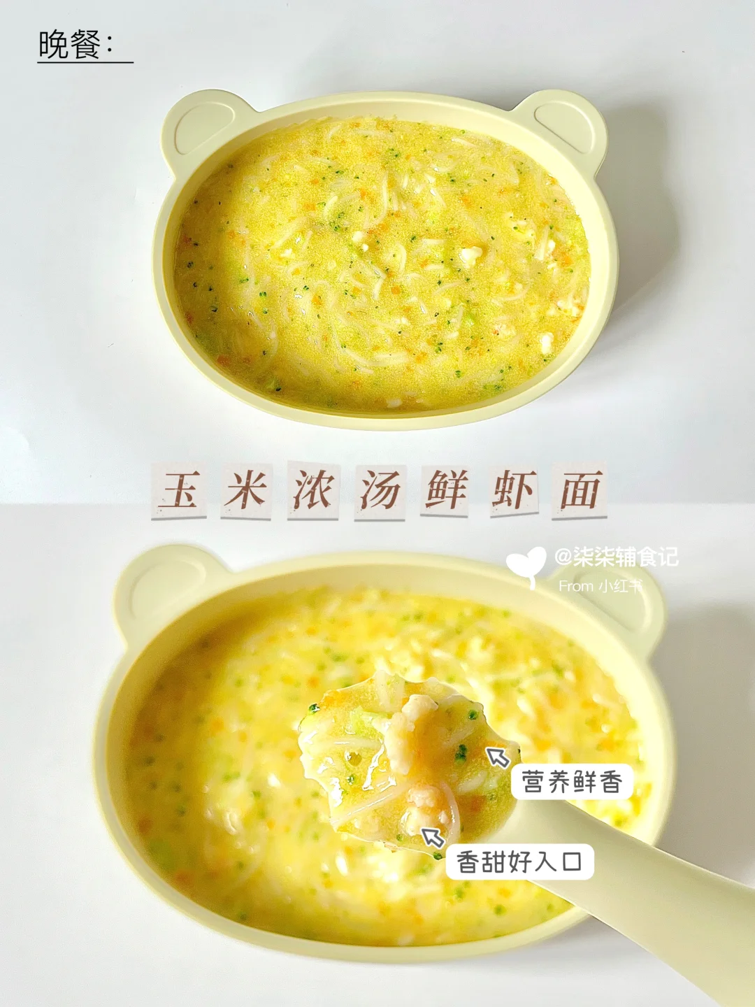 晚餐玉米浓汤鲜虾面,跟玉米搭配的食物就没有宝宝不爱吃的吧!香香甜甜的