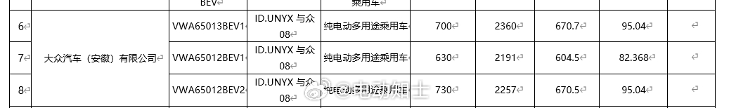 来看看与众08的专属大尺寸运动轮毂,以后还会提供更多的涂装选择,感觉有点帅哦。这也是和小鹏汽车合作的首款车型,大家觉得会卖多少钱[笑而不语] 今天续航信息也申报了,提供82.3kWh和95kWh两种电池容量,CLTC续航分别为630km和700/730km。 与众08大众汽车新能源汽车