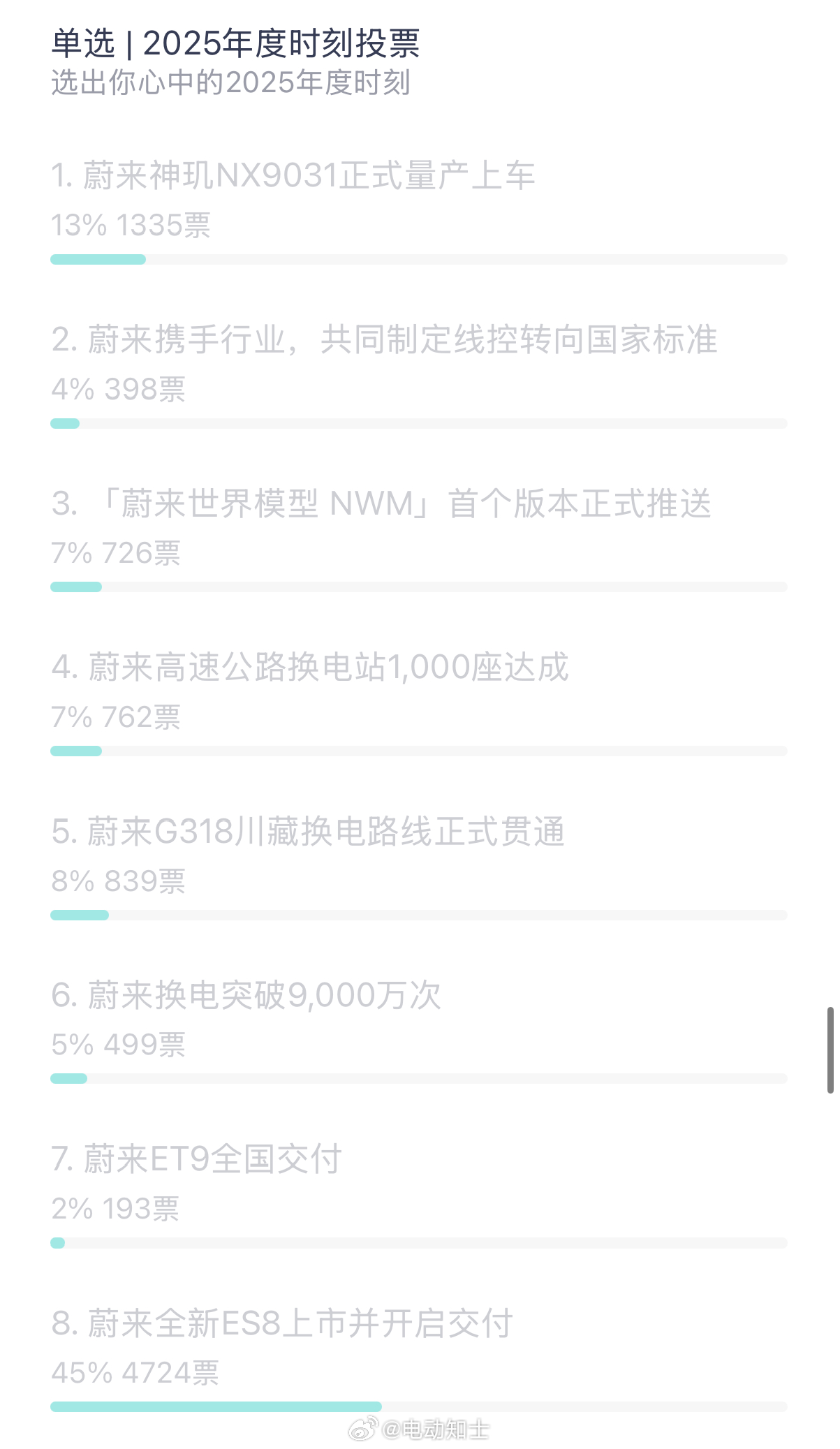 蔚来2025年度时刻的票选,排名第一的是蔚来全新ES8上市并开启交付,第二是蔚来神玑NX9031正式量产上车,第三是蔚来G318川藏换电路线正式贯通。 我选了乐道L90的上市交付,找对了定位很成功的一款产品。你们呢,会投哪个[思考] 附上链接【