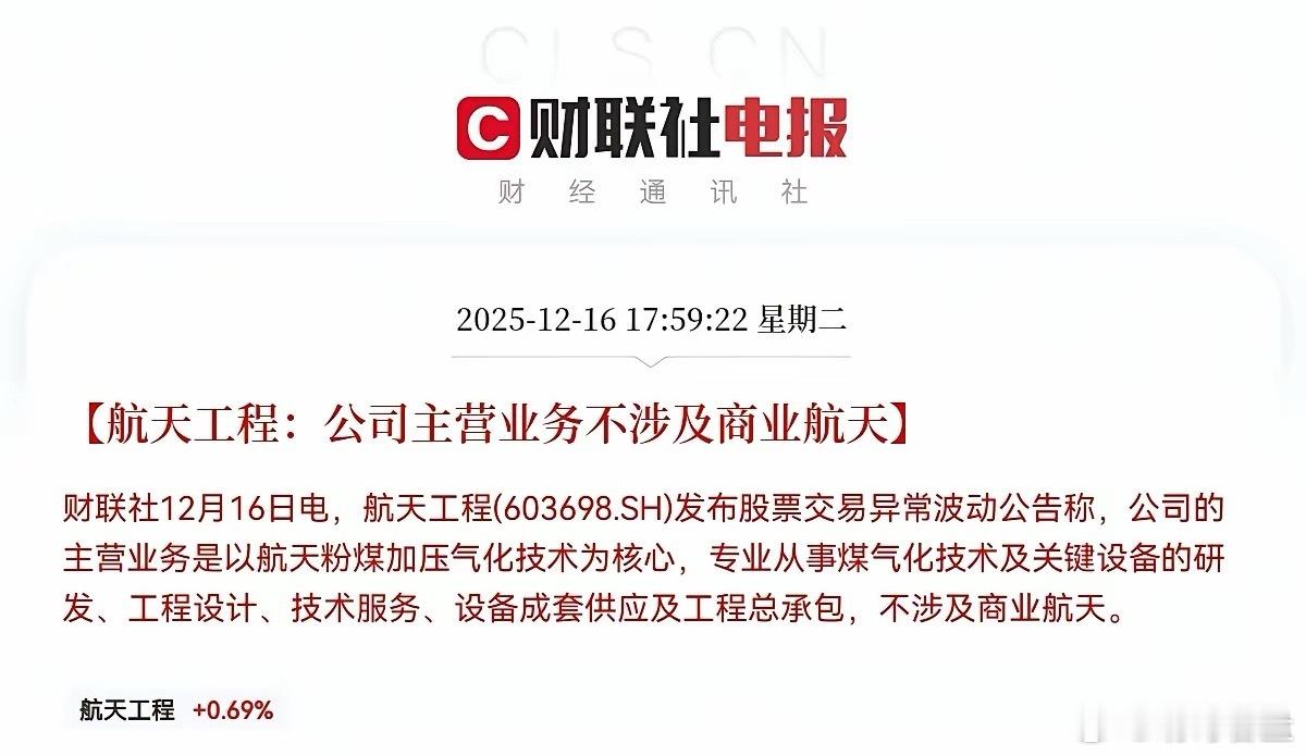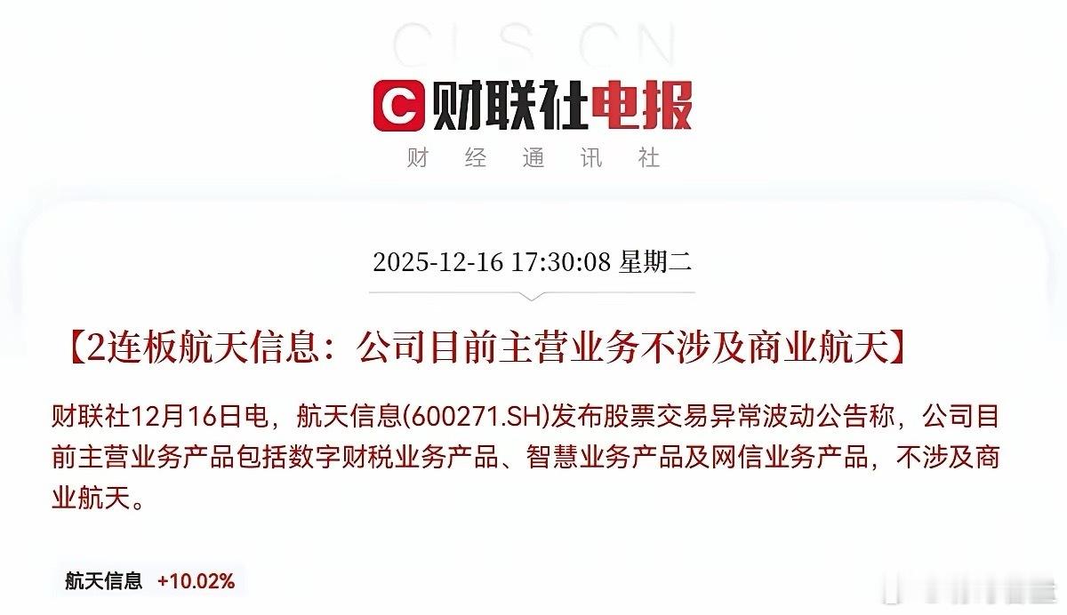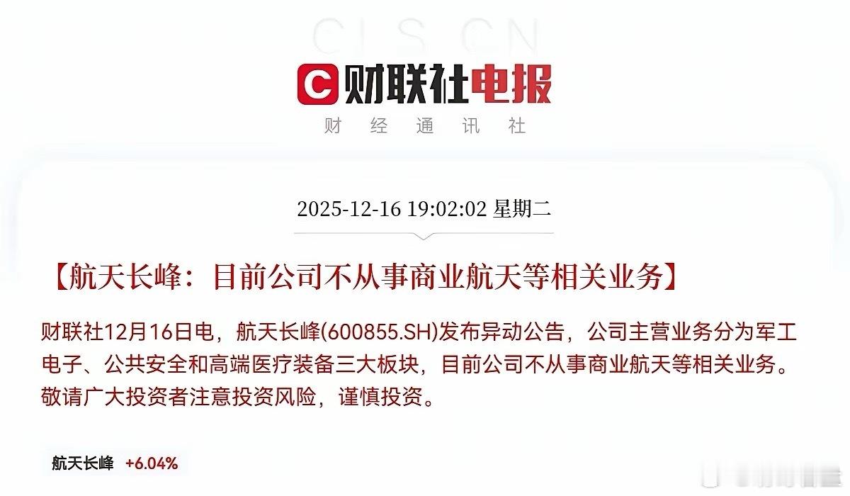 突发消息!突发消息!航天信息、航天工程、航天长峰利空三连发!不出意外的话,明日这三家公司股价要大震荡了,持有这三家公司的股民们,明日恐怕要大面了!就在刚刚!看到三家商业航天概念公司航天信息、航天长峰、航天工程同步发布了股票交易异常波动公告称,公司主营业务不涉及商业航天,这个消息一出,股民们已经群情激奋了,绝大部分认为是利空消息,三家公司近期趁着商业航天概念股价都经历了大幅上涨,航天信息更是走出了两连板,而今晚三家公司都站出来澄清没有商业航天业务,这明显是想给市场情绪降温了,三家公司既然与“商业航天”无关,这直接否定了推动此前股价大涨的核心预期,不出意外的话,明日纯粹炒作该概念的资金很可能选择离场,引发公司股价大震荡!股民们!坐稳扶好!受此利空消息影响,预计明日三家公司要低开低走了,甚至有可能跌停!
